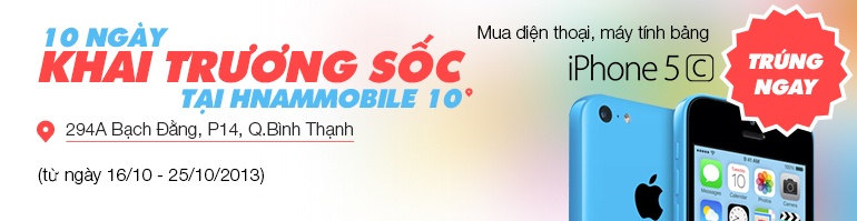 Đặc biệt trong 10 ngày đầu khai trương từ 16/10-25/10, khách hàng mua điện thoại, máy tính bảng tại chi nhánh Hnam Mobile thứ 10 - 294A Bạch Đằng còn có cơ hội bốc thăm may mắn trúng ngay giải nhất Apple iPhone 5C trị giá 12.120.000 đồng, giải nhì: OPPO Find Clover trị giá 4.990.000đ, và giải ba : tai nghe Soul Fly Premium trị giá 2.890.000đ.