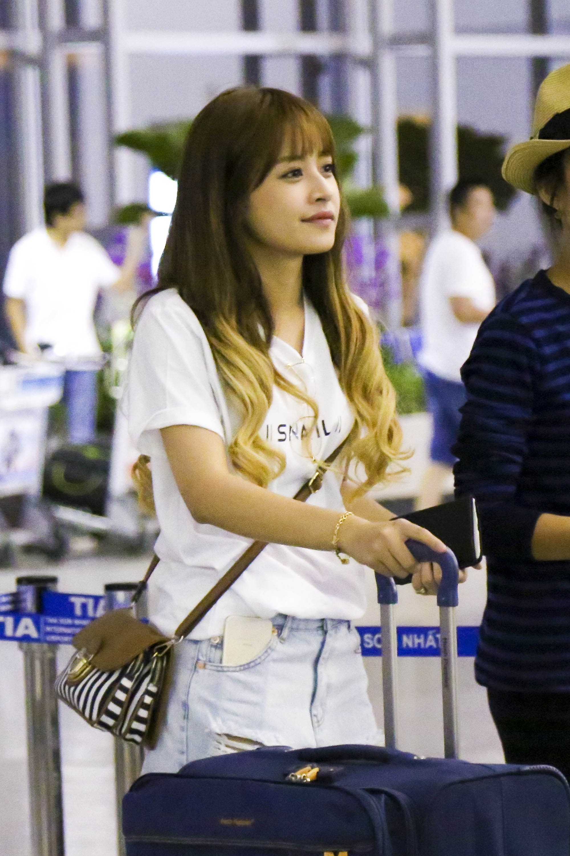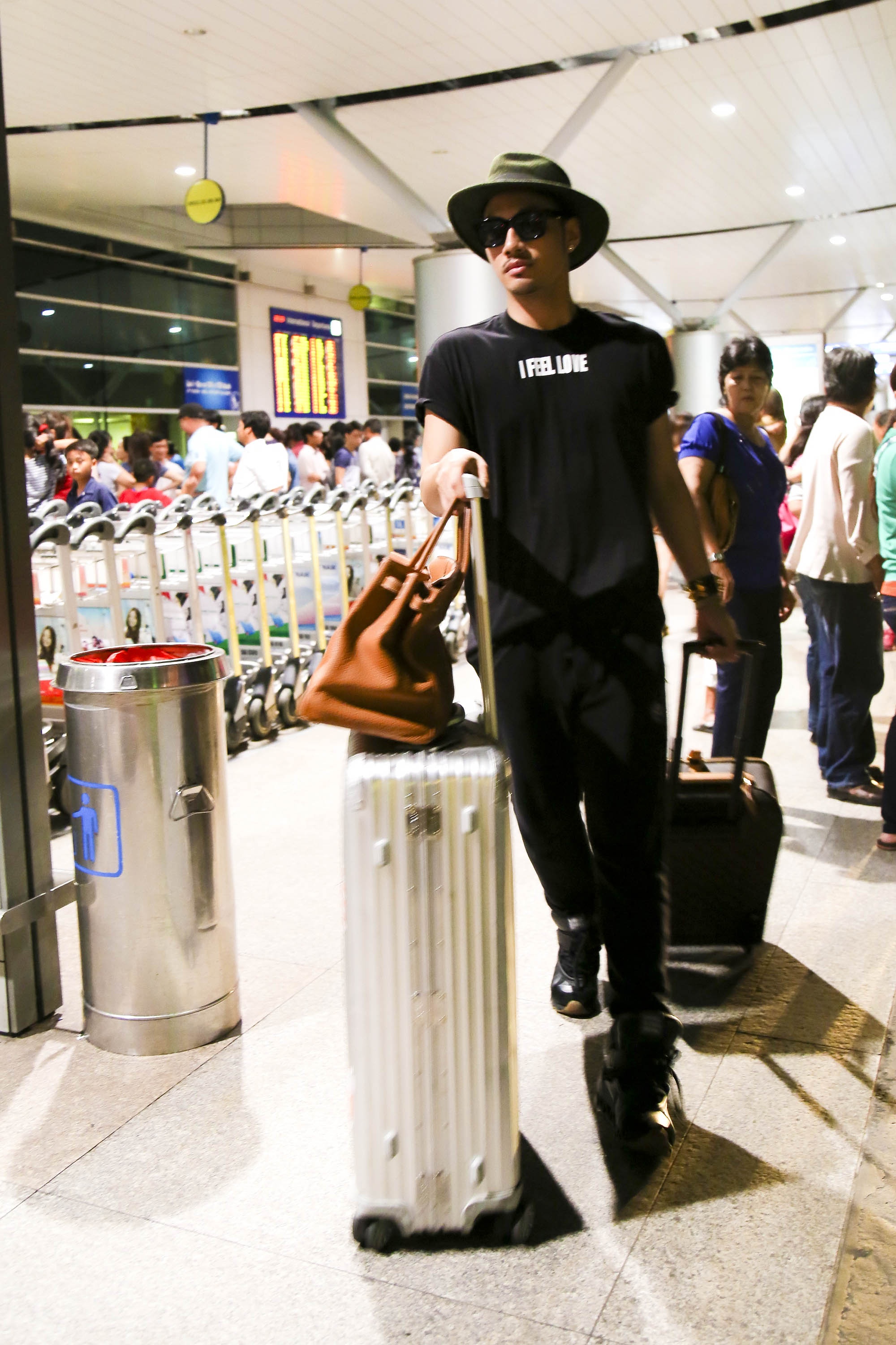 Cặp đôi vướng nghi án yêu đồng giới đều diện áo thun trắng năng động, trẻ trung ra sân bay.