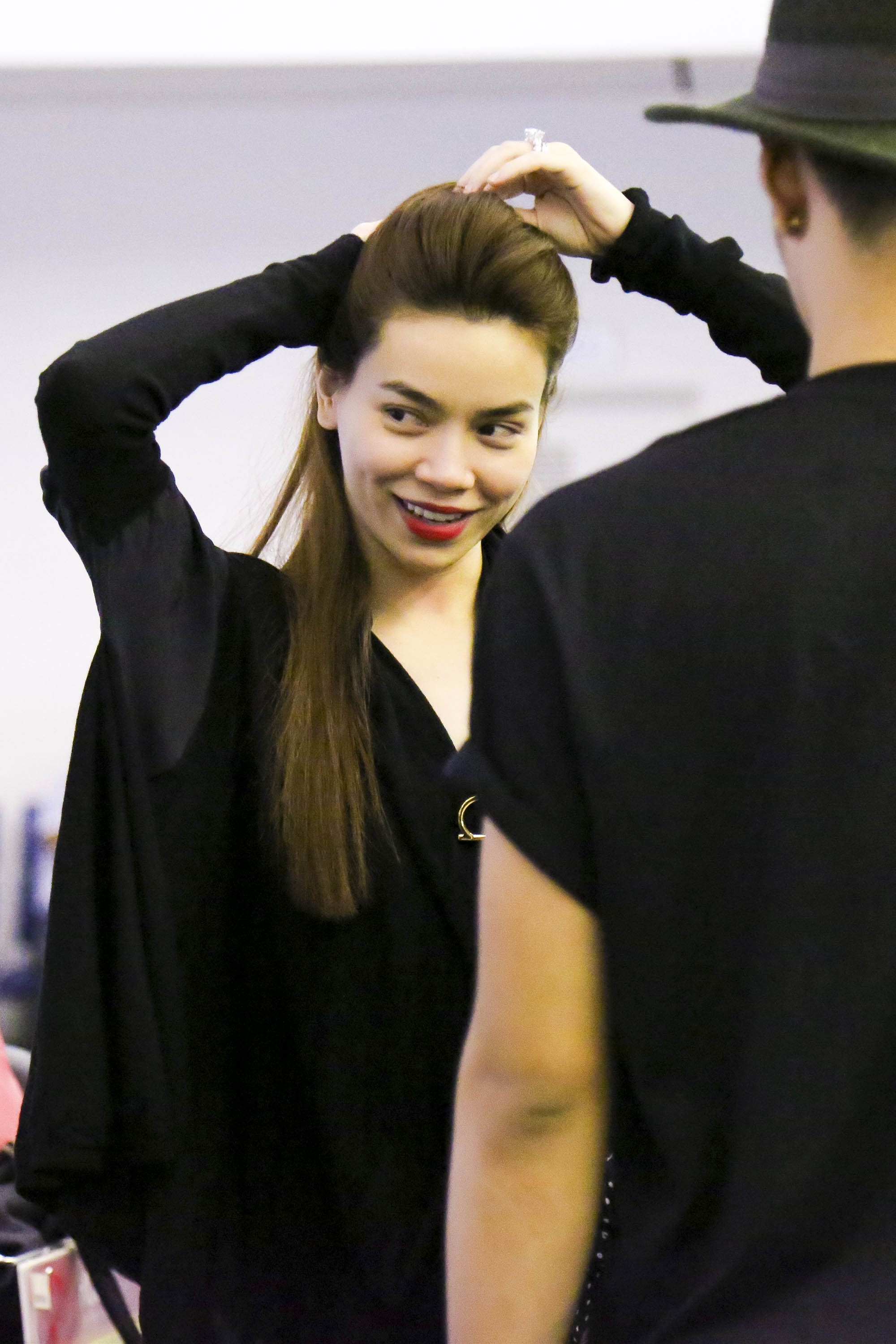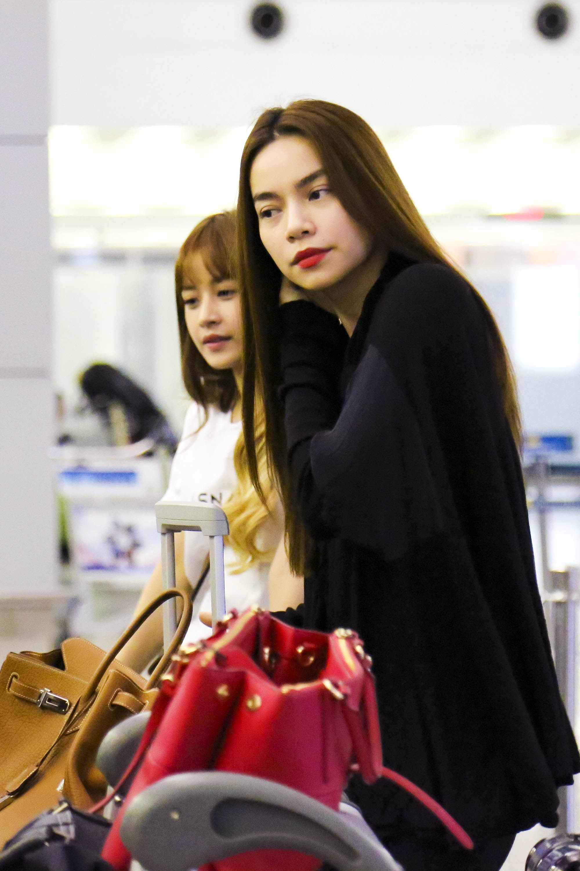 Bà mẹ một con mặc "cây đen" giản dị ở sân bay. Cô tô son đậm nhưng gương mặt lại trang điểm nhẹ nhàng.