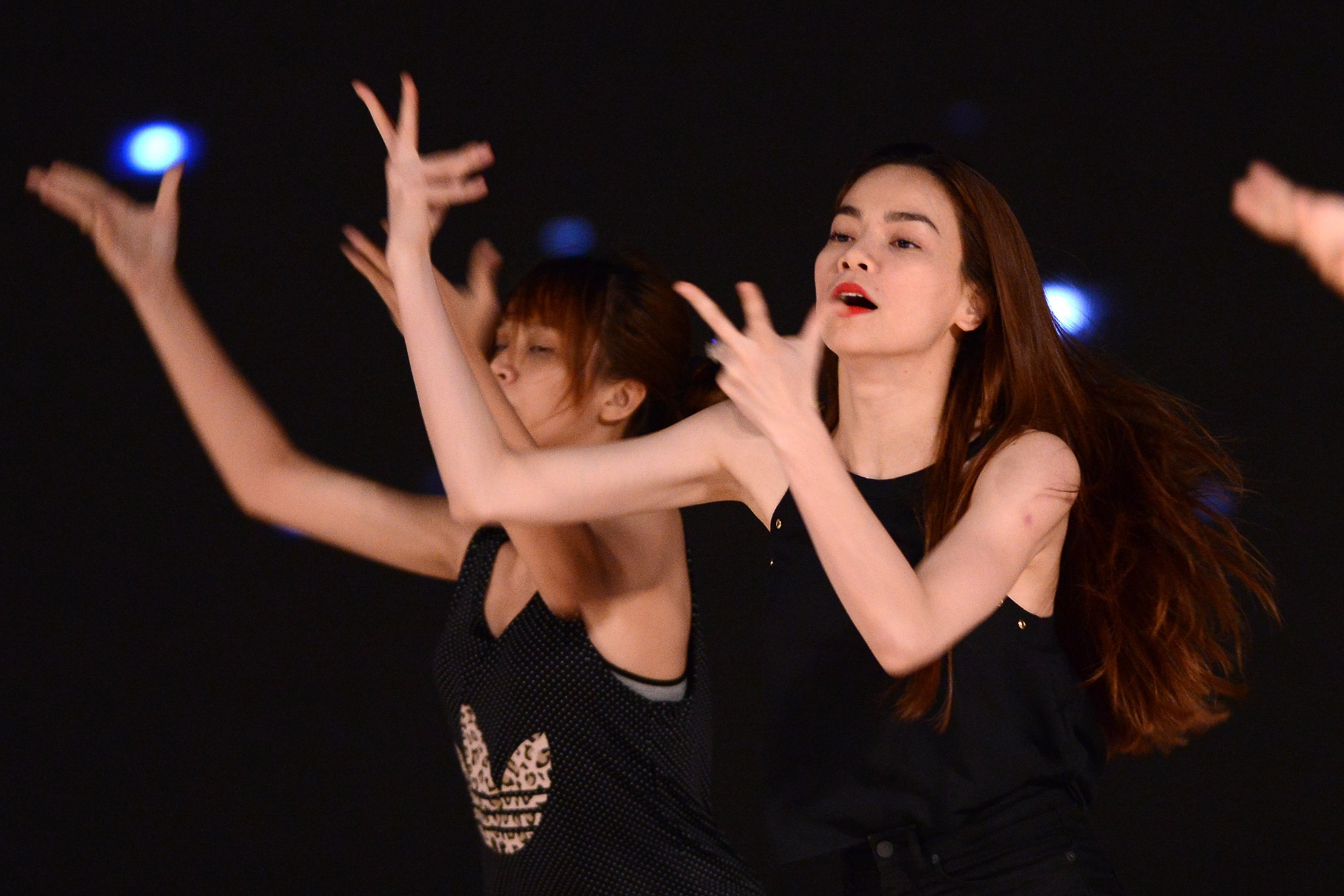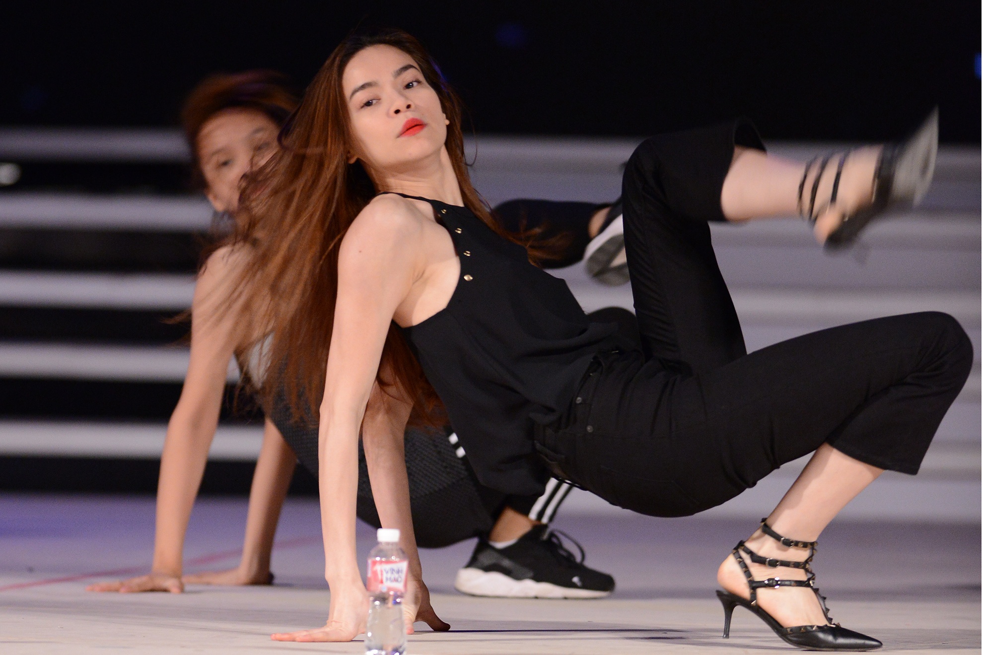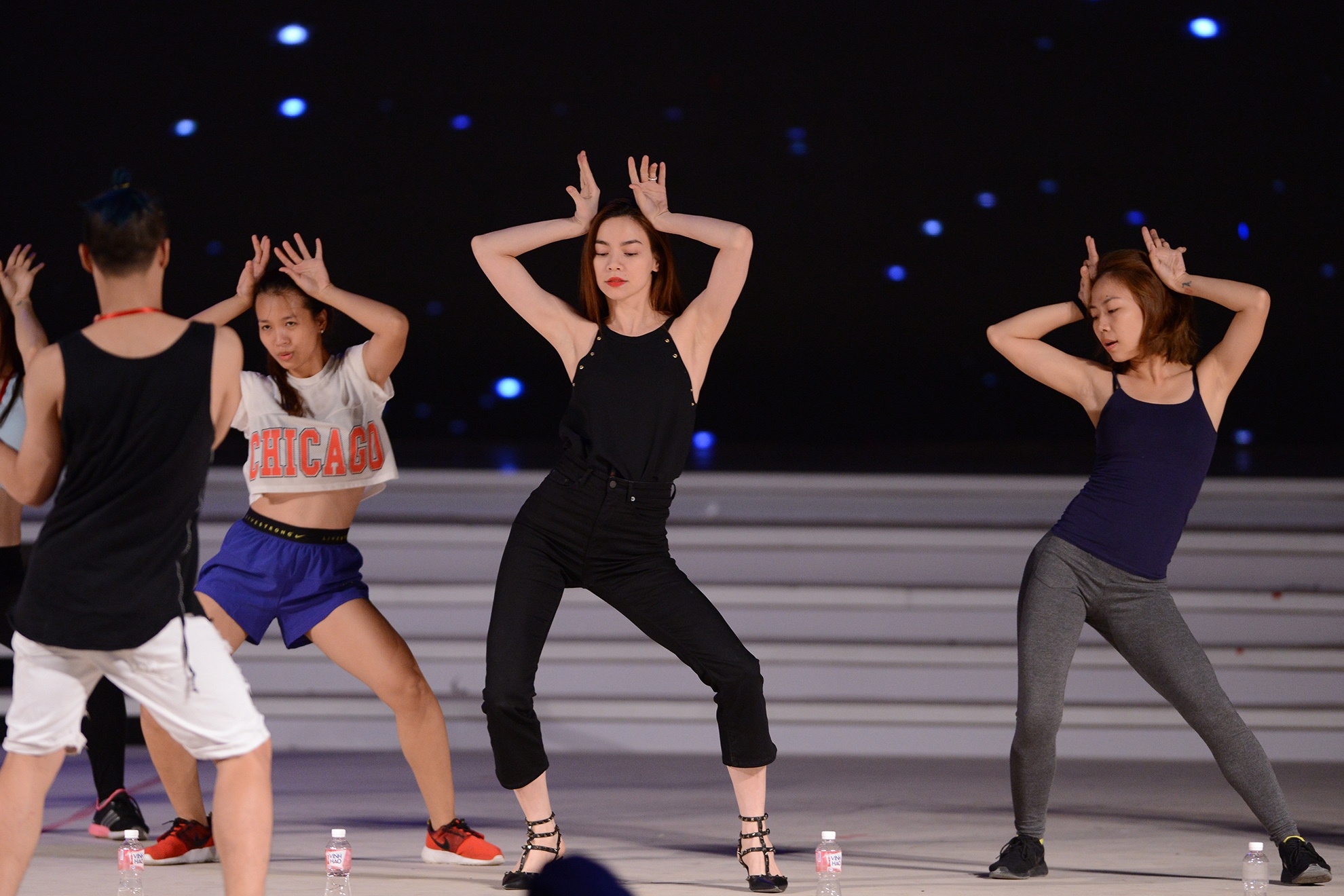 | Hồ Ngọc Hà phối hợp ăn ý với các vũ công trên sân khấu tập luyện. |