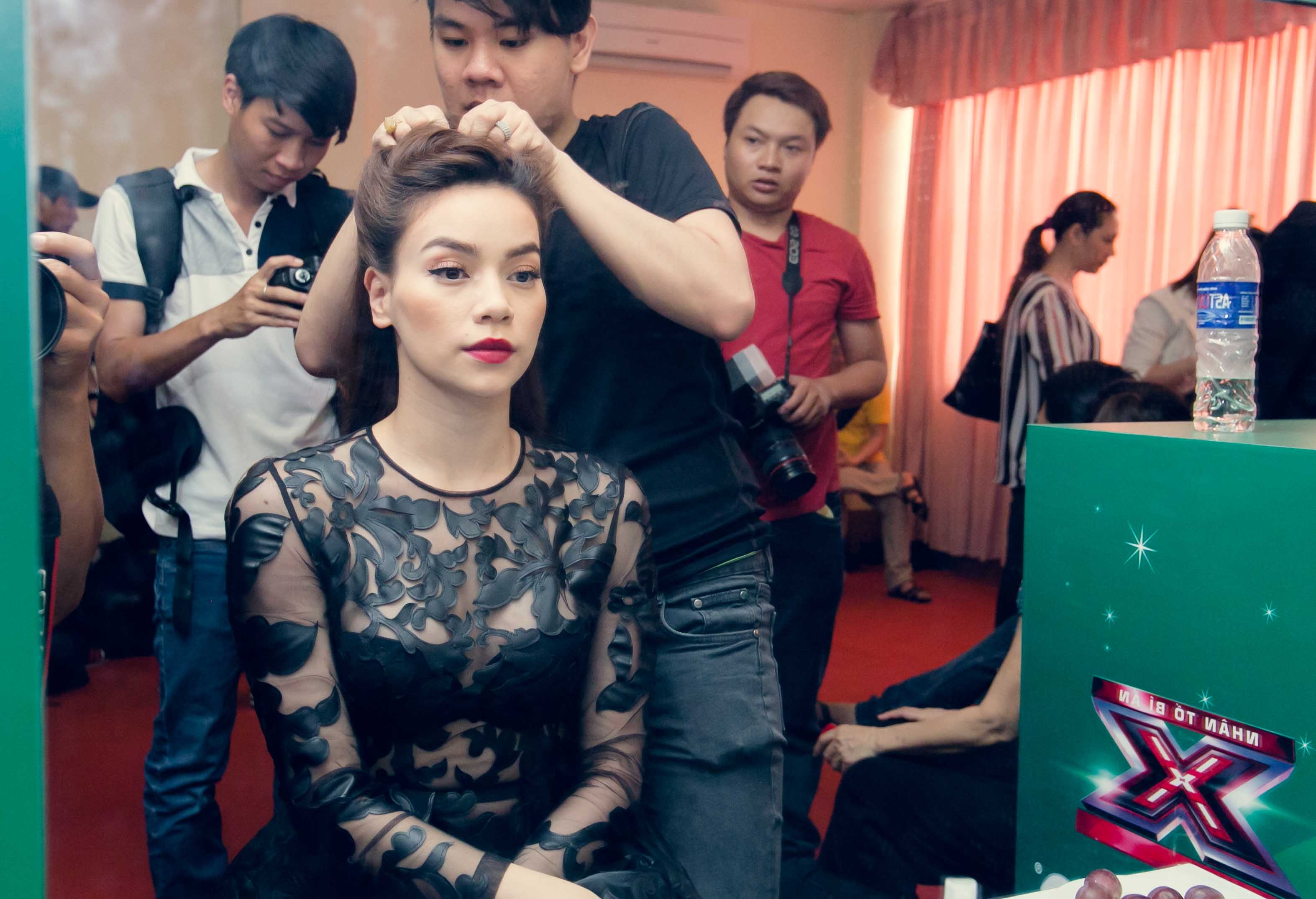 | Hồ Ngọc Hà tranh thủ làm tóc, make up ở phía hậu trường. Sau The Voice, khán giả kỳ vọng Hà Hồ sẽ đem tới không khí vui tươi, trẻ trung cùng những nhận xét đắt giá cho X Factor. |