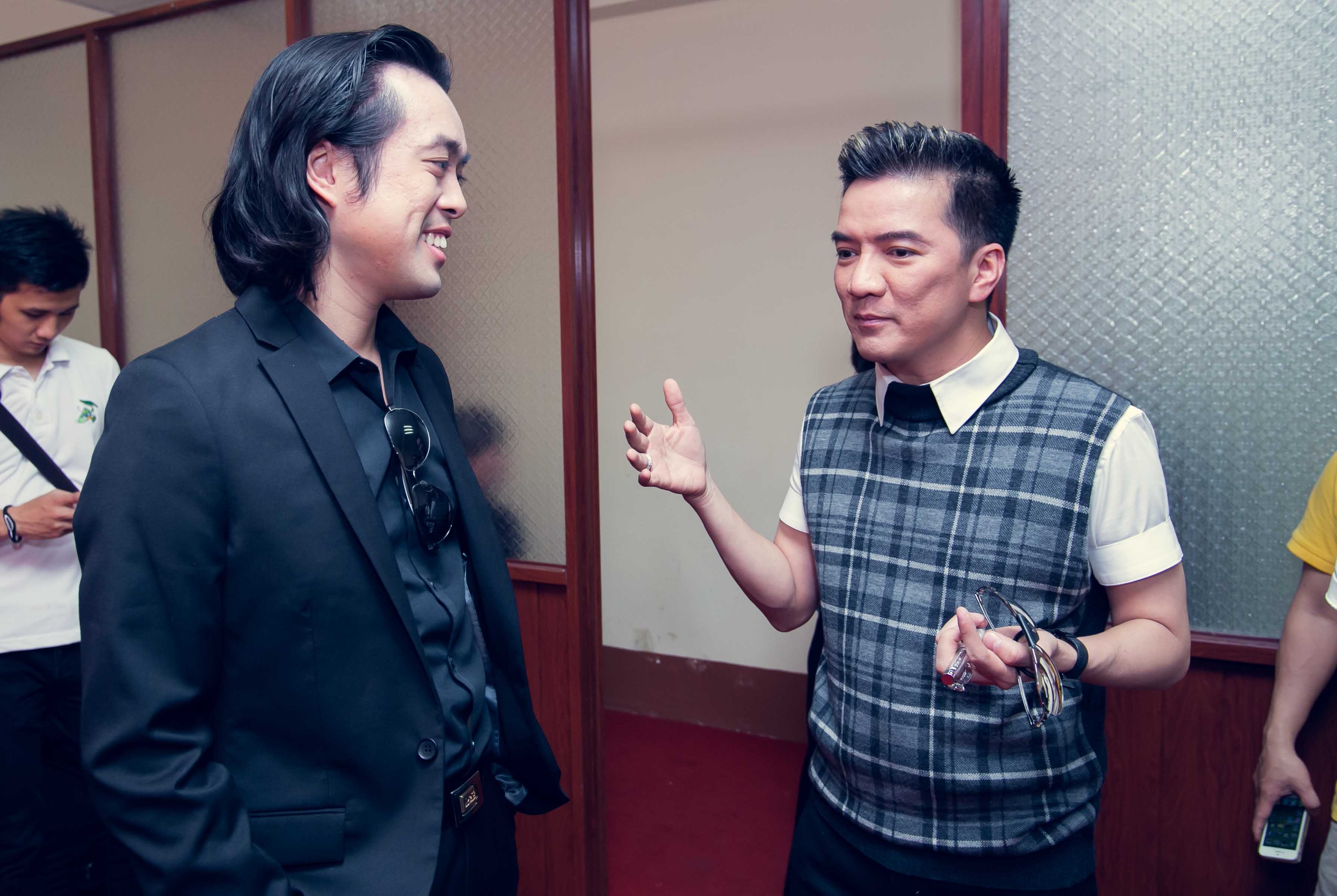 | Dương Khắc Linh và Đàm Vĩnh Hưng - một trong bốn giám khảo X Factor - vui vẻ trò chuyện trước buổi ghi hình. Hiện tại, Nhân tố bí ẩn đang quay hình vòng đầu tiên mang tên Hội ngộ. Chương trình chính thức lên sóng từ ngày 30/3 tới. |