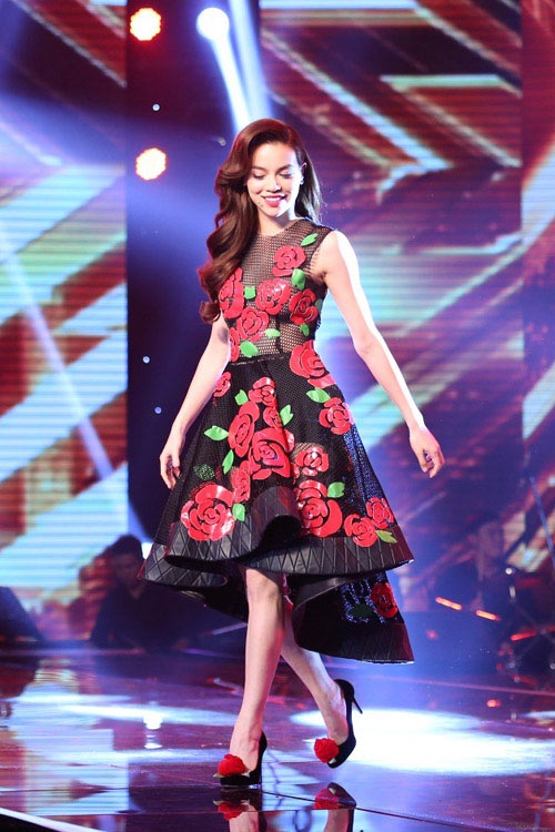 Trên hàng ghế nóng chương trình X Factor 2014, Hồ Ngọc Hà nổi bật với phong thái tự tin, chuyên nghiệp và hình ảnh đẹp mắt. Bà mẹ một con diện bộ đầm cầu kỳ, tinh tế theo phong cách cổ điển, hoa gam màu đỏ nổi bật giữa nền vải tối màu. Chất liệu vải ren lưới xuyên thấu và đôi giày ton-sur-ton khiến cô càng nổi bật, duyên dáng hơn.