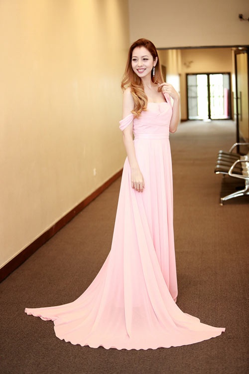 Bà mẹ hai con Jennifer Phạm lại ghi điểm bằng bộ váy dài thướt tha, gam màu hồng phấn nhã nhặn. Kiểu dáng và tông màu được cho là phù hợp với hình ảnh nữ tính và duyên dáng của Hoa hậu châu Á tại Mỹ.