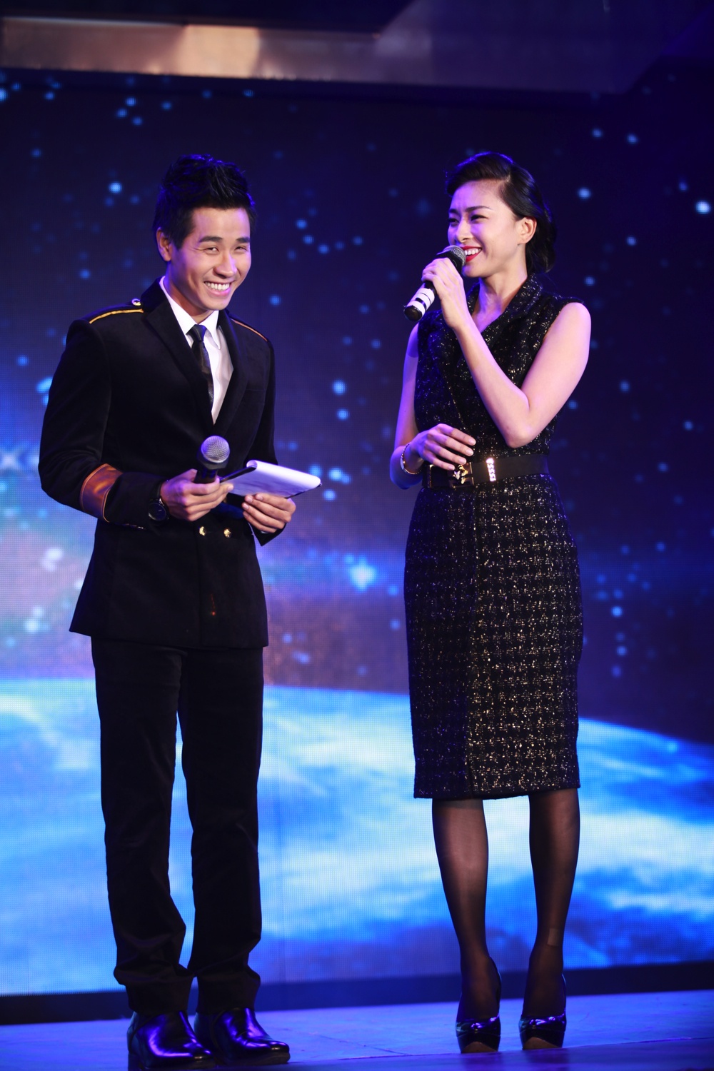 | Với lối trò chuyện dí dỏm, thông minh, Ngô Thanh Vân và MC Nguyên Khang khéo léo tung hứng, đem lại cho khán giả nhiều tiếng cười thú vị. |