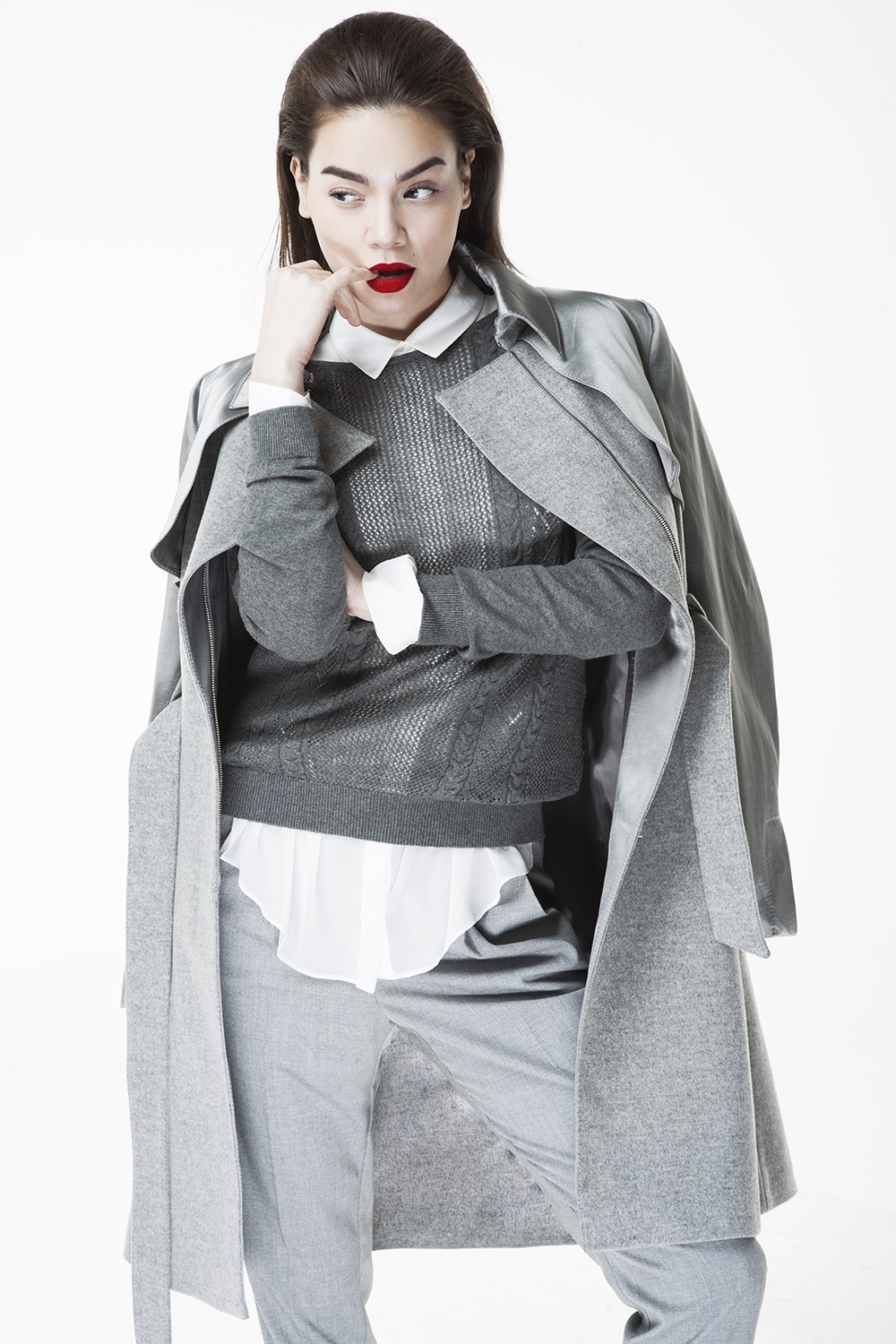 | Màu xám được sử dụng ở nhiều sắc độ và chất liệu tạo cảm giác lôi cuốn, hấp dẫn. Đây cũng là một trong những xu hướng màu sắc nổi bật mùa thu đông 2014. Để phù hợp với trang phục, Hà Hồ chọn cách trang điểm tối giản với đôi môi đỏ là điểm nhấn duy nhất. |