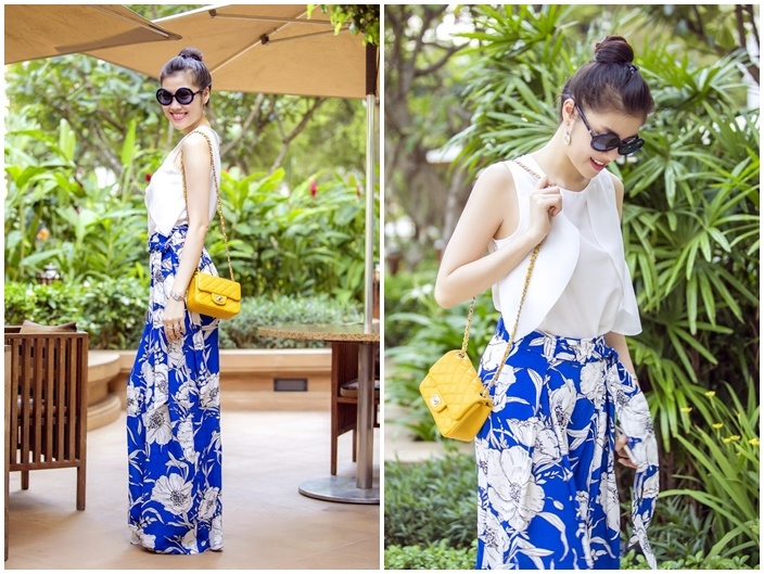 Thu Hằng có buổi gặp gỡ cùng NTK Đỗ Mạnh Cường để bàn về kịch bản MC show diễn Biển nhớ. Trong buổi sáng đẹp trời, bạn gái cũ của người mẫu Vĩnh Thụy khá nền nã với quần họa tiết ống rộng, áo voan trắng nhã nhặn, túi xách Chanel nổi bật.