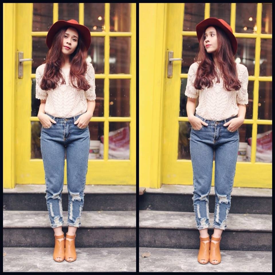 Một ngày khác, bà mẹ một con năng động với jeans rách gấu và áo ren nữ tính.