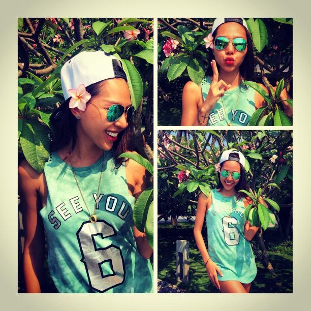 Minh Triệu có chuyến công tác tại Huế, tham gia sự kiện Festival 2014. Trong tiết trời nóng bức của miền Trung, nữ người mẫu da nâu diện áo thun ba lỗ in số cá tính. Mũ lưỡi trai kèm kính râm tinh nghịch.