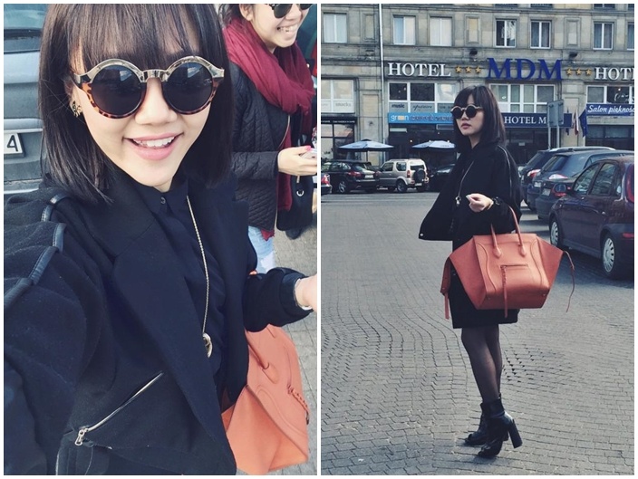 Tuần vừa qua, nữ ca sĩ Vietnam Idol - Văn Mai Hương có chuyến lưu diễn tại Ba Lan. Trên những con phố hiện đại tại trung tâm thành phố, nữ ca sĩ nổi bật với bộ cánh tông đen tuyền phá cách và cá tính. Túi xách hàng hiệu gam màu cam làm điểm nhấn.