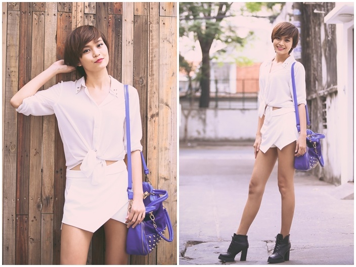Ca sĩ Thu Thủy ăn vận khá phóng khoáng khi kết hợp chân váy xẻ thân trước cùng áo sơ mi hiện đại khi có dịp xuống phố cùng người yêu. Quán quân Bước nhảy hoàn vũ 2014 luôn trung thành với kiểu tóc suôn thẳng nhẹ nhàng, nữ tính.