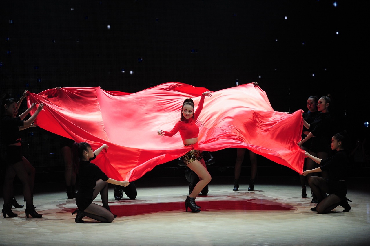 Cô diện trang phục gợi cảm và khoe vũ đạo ấn tượng cùng các vũ công. |
