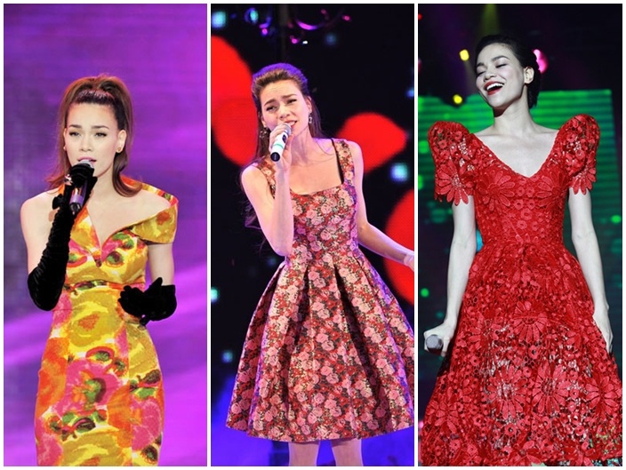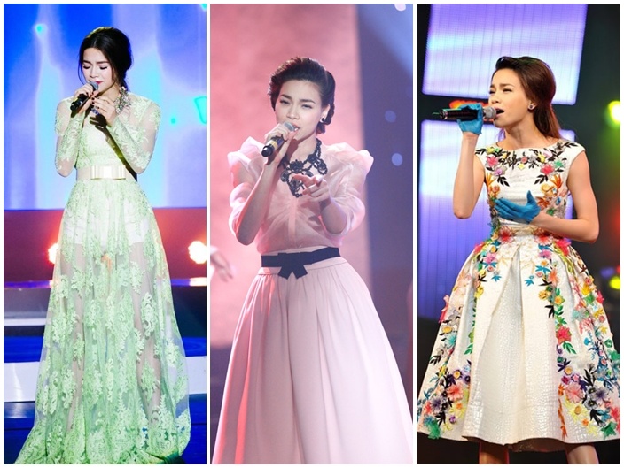 Tông màu trơn: Gam màu đơn sắc toát lên vẻ đẹp giản đơn, nhưng lại tinh tế và dễ dàng ứng dụng trong nhiều hoàn cảnh. Tận dụng ưu thế này, nhiều ca sĩ làng nhạc Việt đã sử dụng khá hiệu quả những sắc độ một màu để nổi bật trên sân khấu. Ngay cả nữ ca sĩ có ngoại hình hoàn hảo Hồ Ngọc Hà cũng không ngoại lệ. Cô thường xuất hiện tự tin, ấn tượng với những thiết kế mới lạ có gam màu trơn tinh tế.