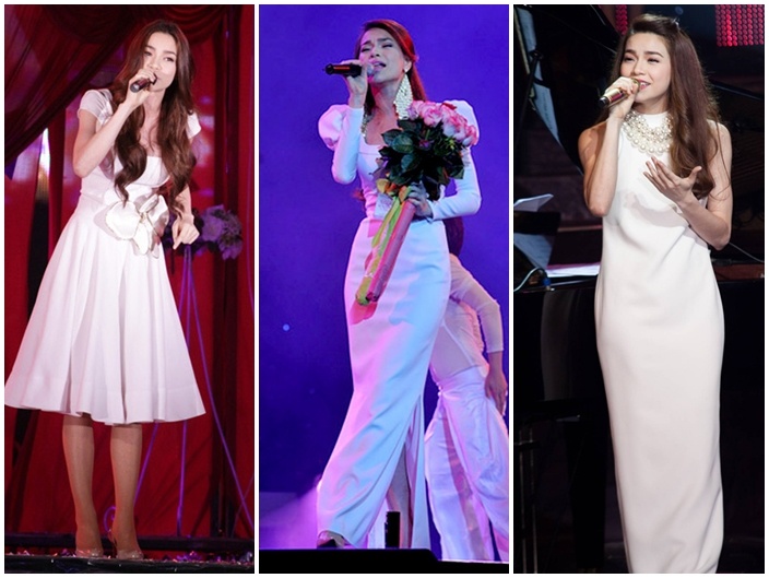 | Với trang phục cổ điển, nhà thiết kế của Hồ Ngọc Hà khá tinh tế trong cách chọn gam màu phù hợp với xu hướng. Gam màu trắng thuộc list yêu thích và xuất hiện đồng hành cùng nữ ca sĩ ở nhiều chương trình lớn nhỏ. |