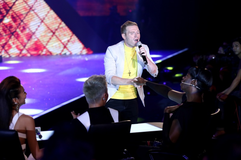| Anh có phần giao lưu rất dễ thương với Miss Jay - vị giám khảo khách mời đến từ Mỹ. |