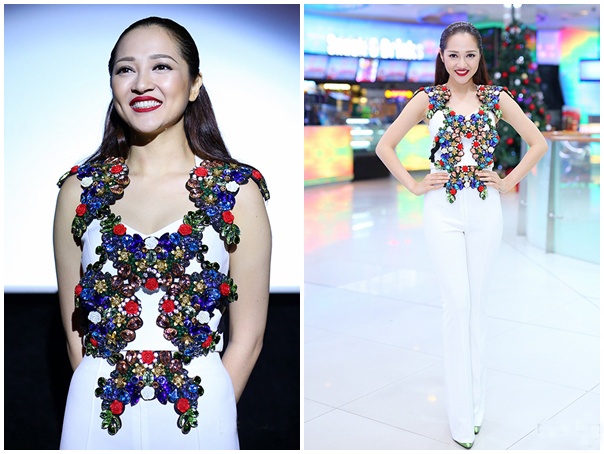 | Thiết kế đính kết rườm rà đưa Bảo Anh vào nhóm trang phục kém tinh tế tuần qua. Chi tiết hạt trang sức nhiều màu lỗi thời và kém thanh thoát. Ảnh: Maison de Bil |