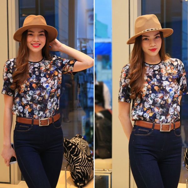 | Quần jeans, áo sơ mi hoa văn màu kết hợp mũ fedora tạo cho Hồ Ngọc Hà vẻ đẹp năng động, hiện đại trong lần xuất hiện gần đây. |