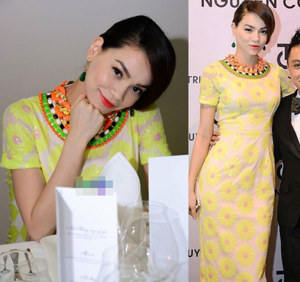 | Chiếc váy thêu hoa rất sang trọng và hợp với vóc dáng gầy của Hồ Ngọc Hà. |