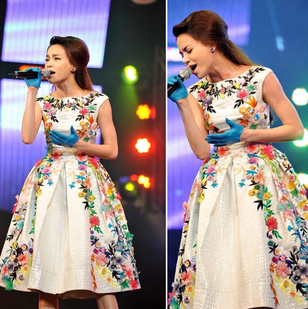 | Hồ Ngọc Hà xinh như hoa khi chọn chiếc váy hoa thiết kế xoè cổ điển biển diễn trên sân khấu. |