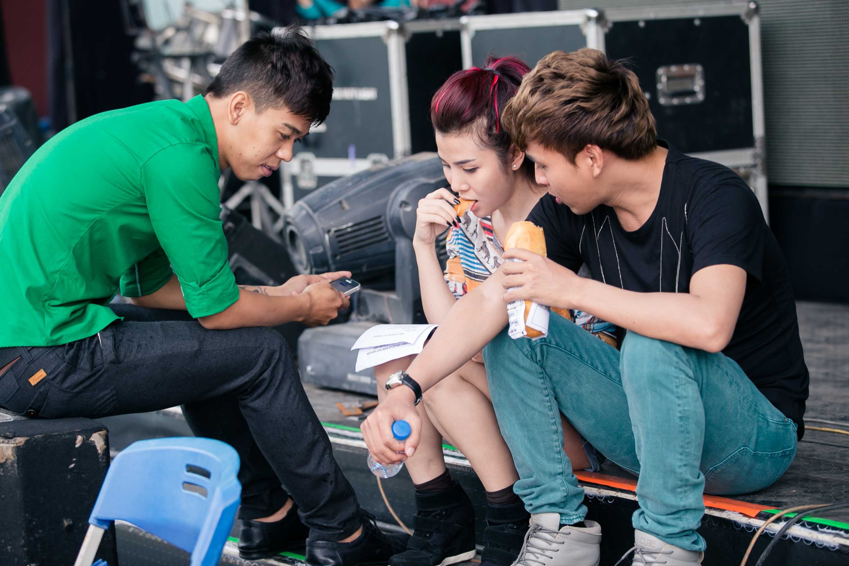 Hồ Quang Hiếu ăn vội bánh mì trong lúc tổng duyệt minishow