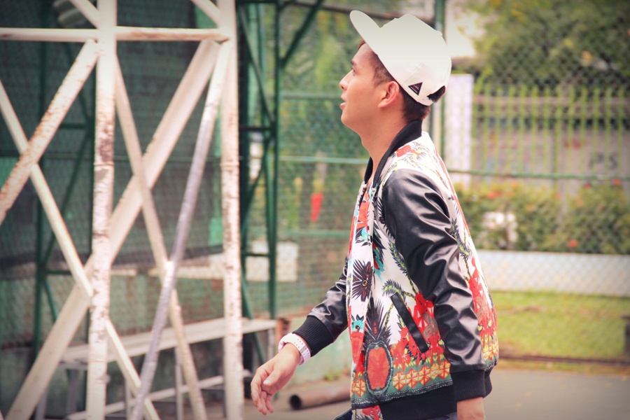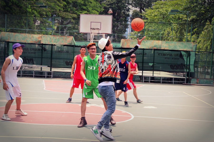 Hồ Quang Hiếu mặc trang phục hiphop sặc sỡ chơi bóng rổ