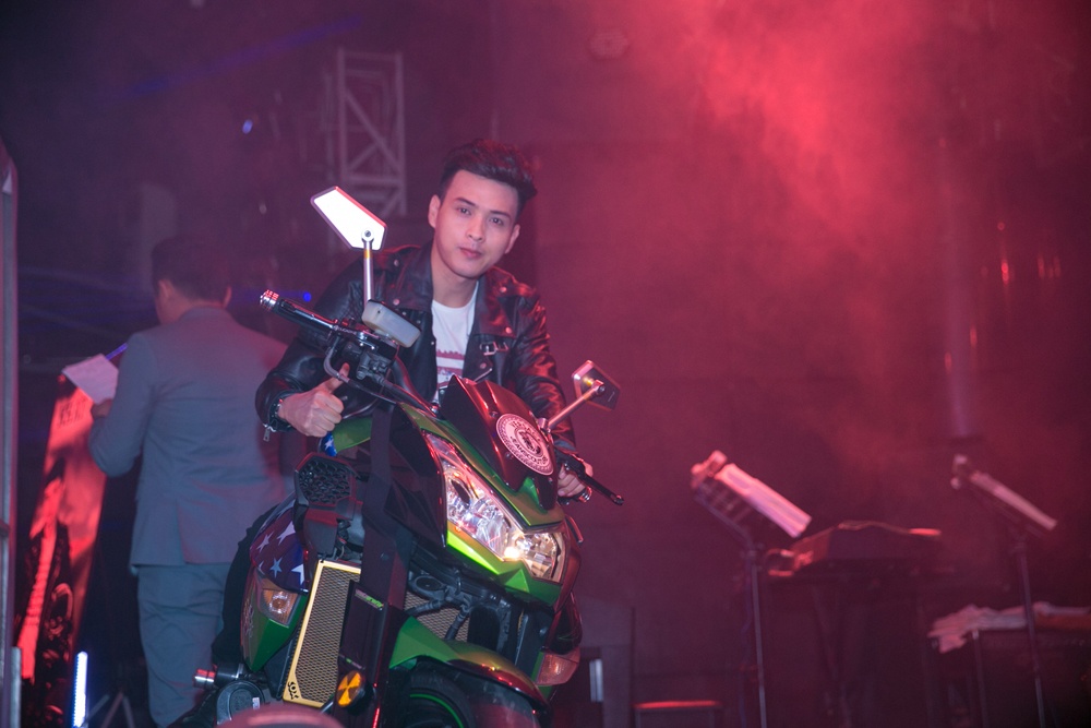 | Mở màn buổi họp báo, Hồ Quang Hiếu xuất hiện cùng với chiếc môtô trị giá 500 triệu đồng khiến các fan hò hét không ngừng. |