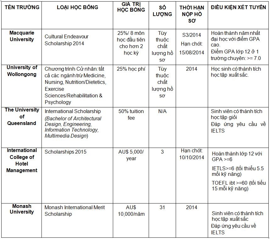 Nhiều trường tại Úc có 3 kỳ tuyển sinh trong năm (xem danh sách bên dưới). IDP hỗ trợ vé máy bay một chiều đi Úc trị giá 6 triệu đồng cho học sinh, sinh viên nộp hồ sơ tại văn phòng IDP tại TP.HCM và Hà Nội từ 2/7 đến 30/8 có visa sớm nhất và trước 30/1/2015.