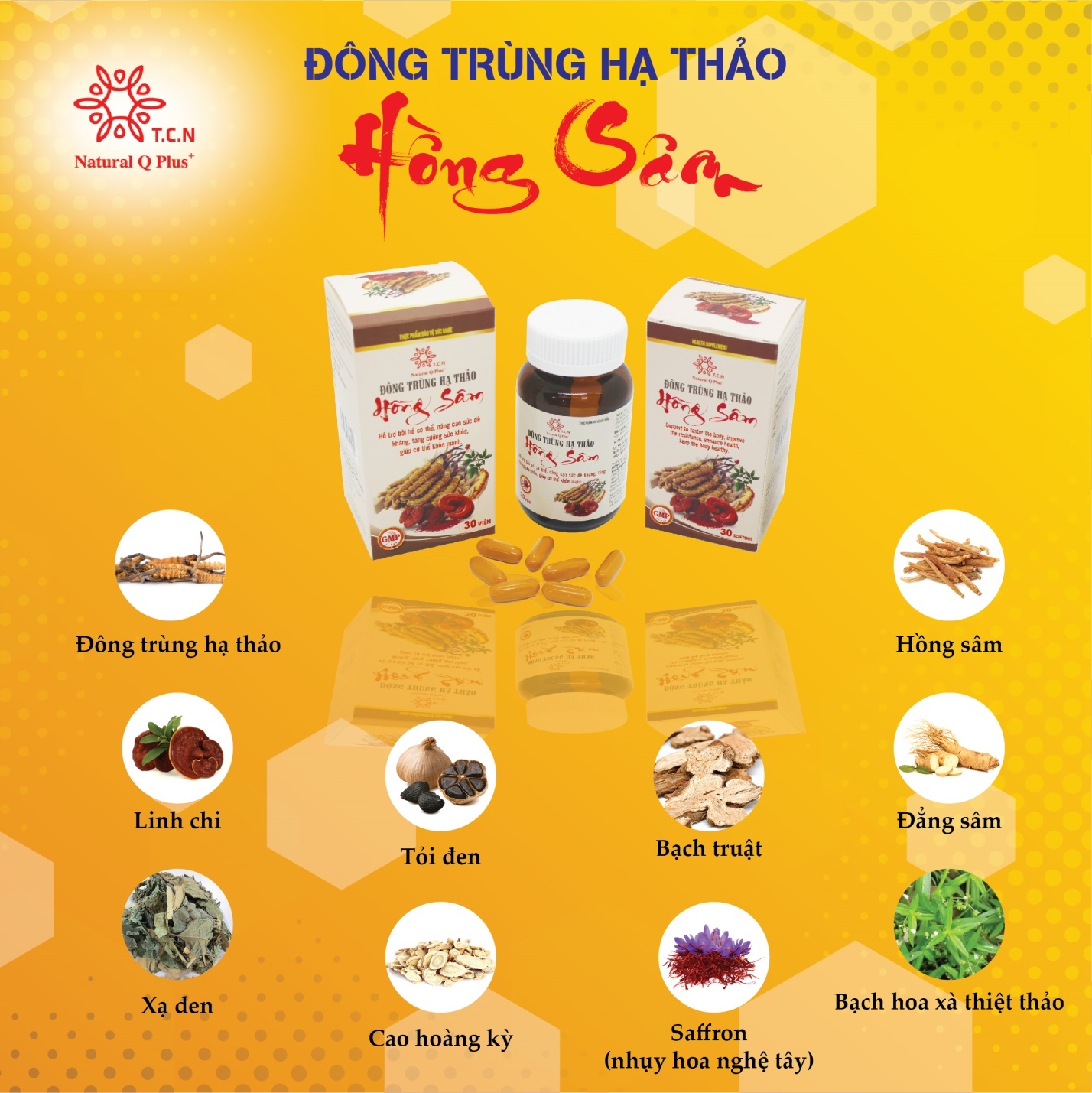 Từ xa xưa, đông trùng hạ thảo được sử dụng như thực phẩm hỗ trợ tăng cường sức đề kháng cho cơ thể. Thực phẩm bảo vệ sức khỏe Đông trùng hạ thảo hồng sâm có thành phần chính từ đông trùng hạ thảo và hồng sâm. Natural Q Plus+ sáng chế sản phẩm bằng công thức lấy đông trùng hạ thảo là thành phần chính, kết hợp 9 loại thảo dược bao gồm linh chi, đẳng sâm, bạch truật, xạ đen, bạch hoa xà thiệt thảo, tỏi đen, hoàng kỳ và nhụy hoa nghệ tây (saffron).