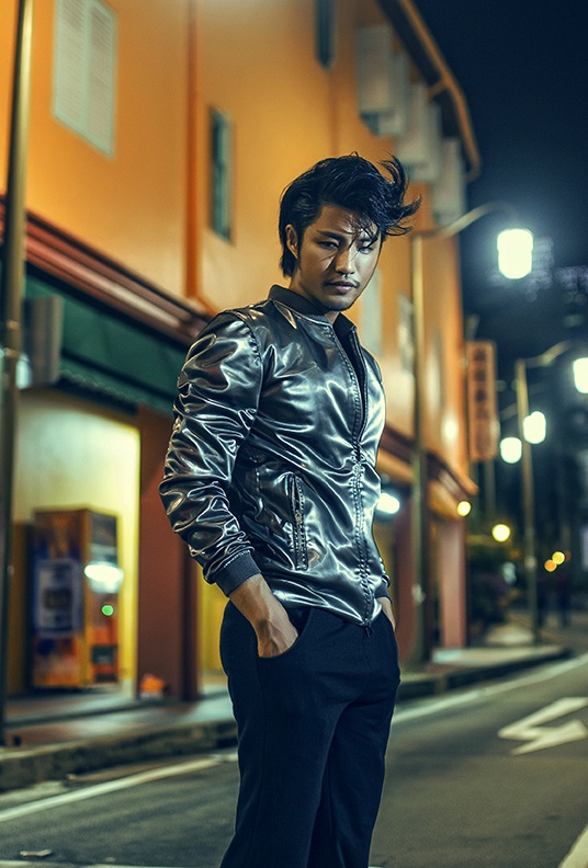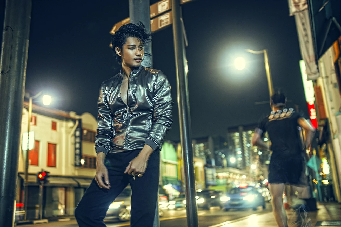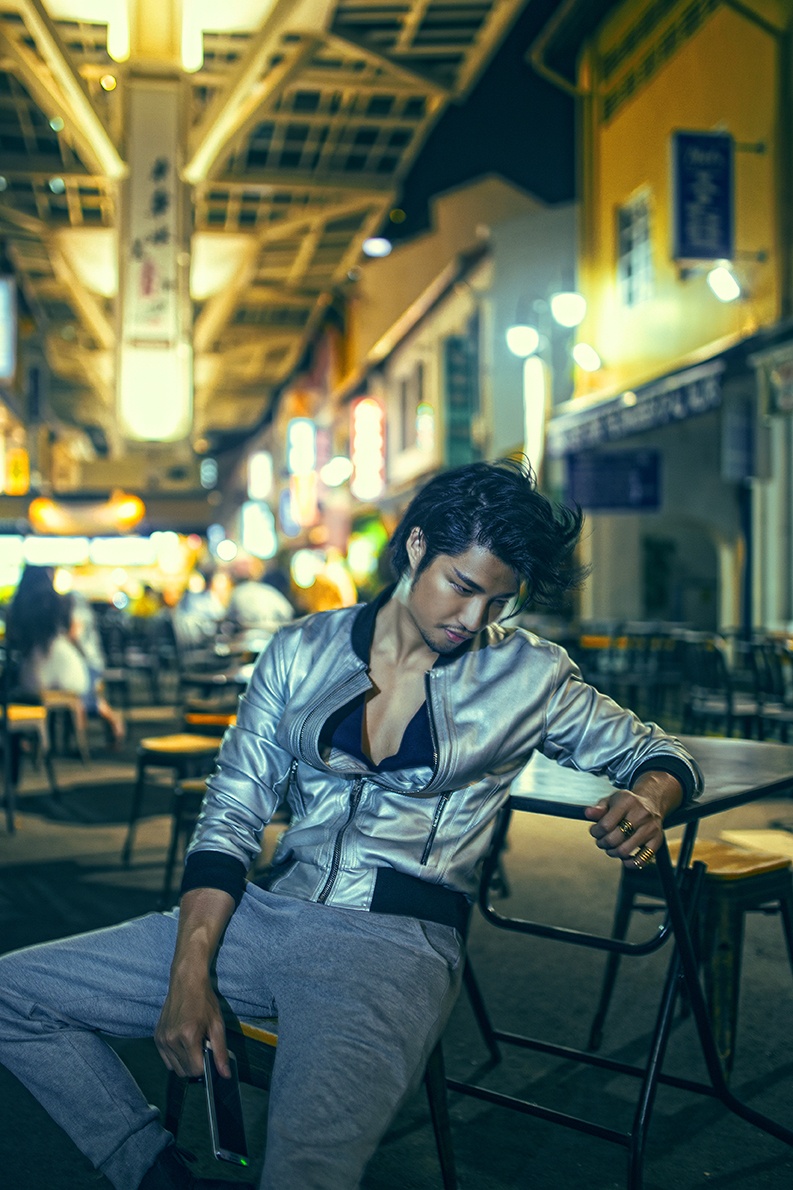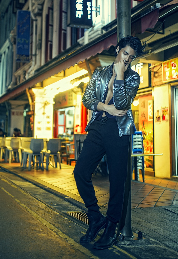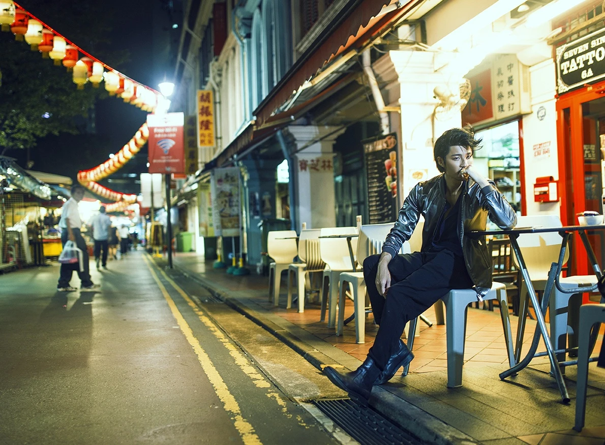 | Hồ Vĩnh Anh mời ê-kíp từ Việt Nam sang Singapore thực hiện bộ ảnh tại khu phố tàu. Để có được khung ảnh huyền ảo, nam người mẫu và nhiếp ảnh gia chọn thời điểm đêm khuya, là lúc đường phố vắng lặng mới bấm máy. |