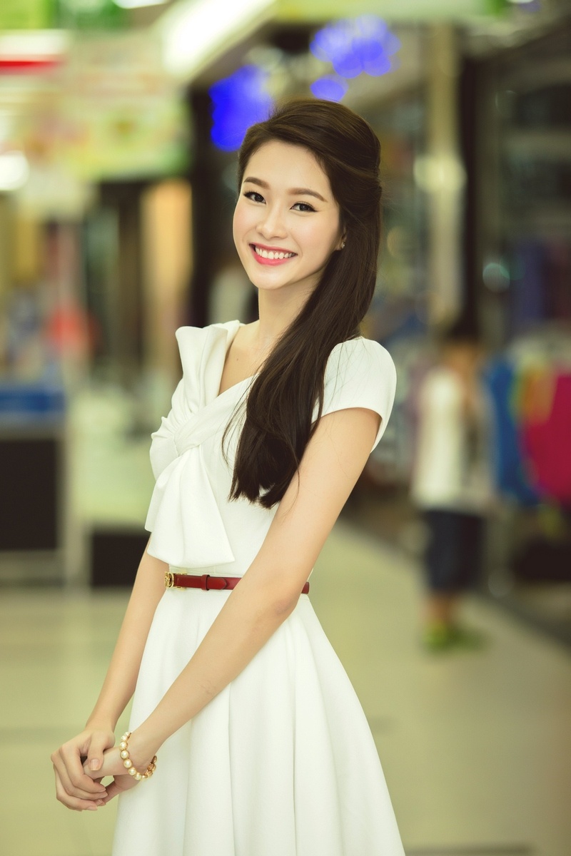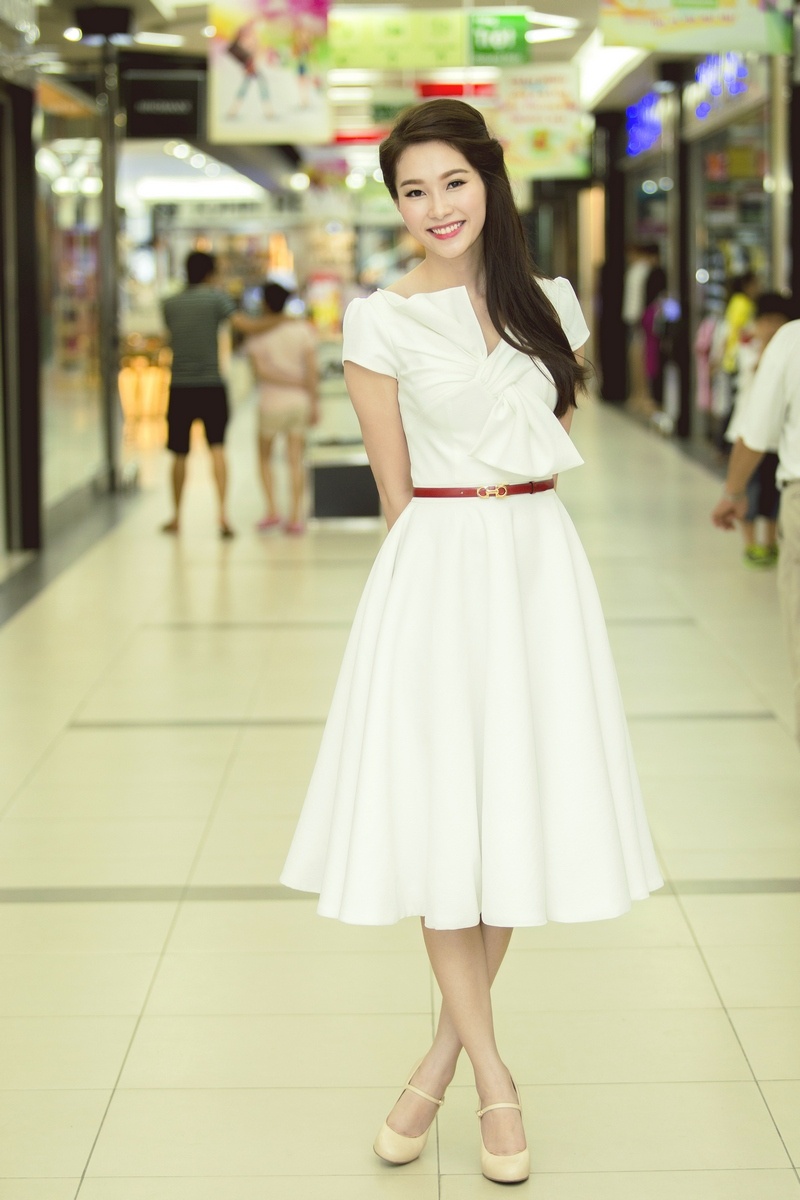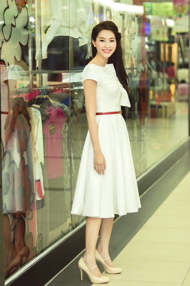 Người đẹp chọn một thiết kế váy nữ tính, nhẹ nhàng tôn vinh vóc dáng kiều diễm, tông màu trắng khá phù hợp với hình tượng nữ tính vốn có của người đẹp.