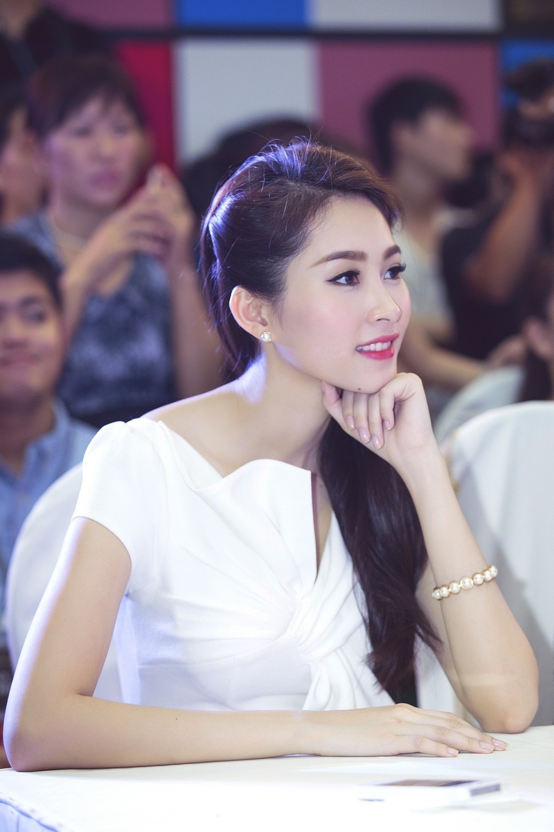 ''Hoa hậu Việt Nam 2012'' nổi bật trên hàng ghế giám khảo nhờ vẻ đẹp ngày càng duyên dáng và dịu dàng, cô diện một thiết kế gam màu trắng nền nã tôn vinh vẻ đẹp trong trẻo.