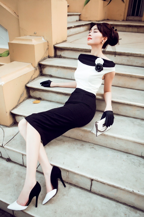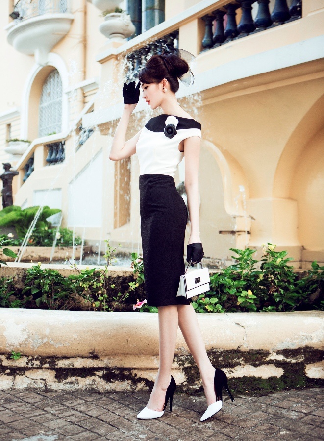 | Những thiết kế cổ điển với ba tông màu trắng, đen, đỏ kết hợp cùng chiếc túi xách nhỏ và những phụ kiện đi kèm làm tôn lên nét đẹp quyến rũ, sang trọng của hoa hậu. |