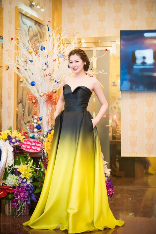 | Á hậu Dương Tú Anh cũng là điểm nhấn đáng chú ý tại sự kiện giải trí tuần qua nhờ bộ váy dạ hội gam màu ửng vàng của NTK Huy Trần. Thiết kế tông màu rực rỡ tôn làn da trắng sáng và nét đẹp nữ tính của Á hậu Việt Nam 2012. |