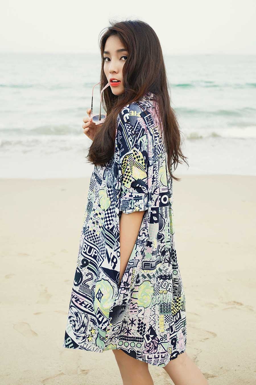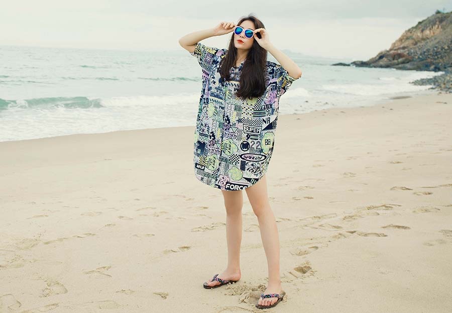 | Trong chuyến du lịch Nha Trang gần đây, hoa hậu Nguyễn Cao Kỳ Duyên kết hợp thực hiện bộ ảnh thời trang trên biển. Người đẹp 19 tuổi diện sơ-mi hoạ tiết dáng dài "giấu quần" khi tản bộ. |