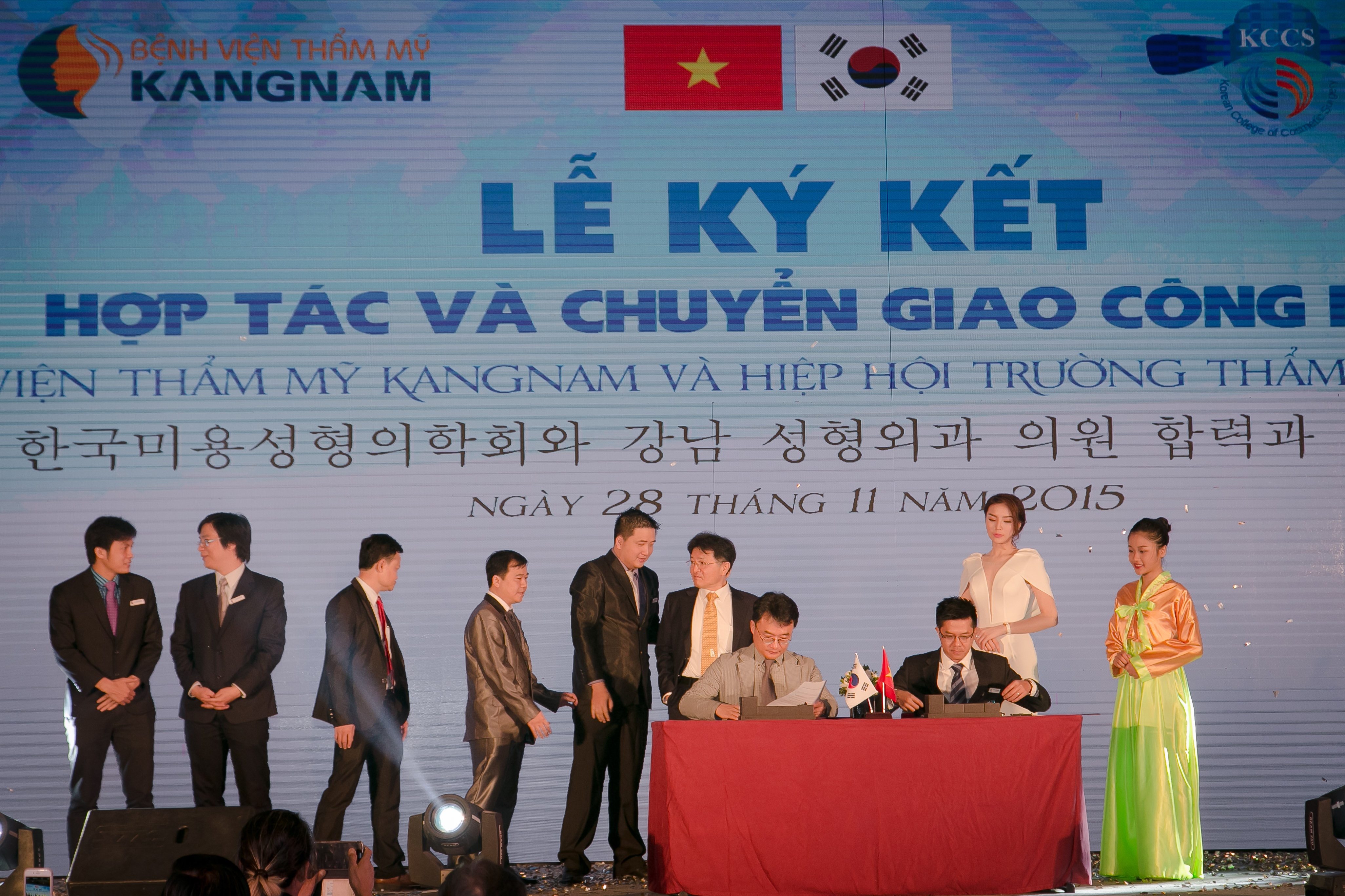 | Lễ ký kết chuyển giao công nghệ Hàn Quốc cho bệnh viện thẩm mỹ Kangnam dưới sự chứng kiến của Hoa hậu Kỳ Duyên. |