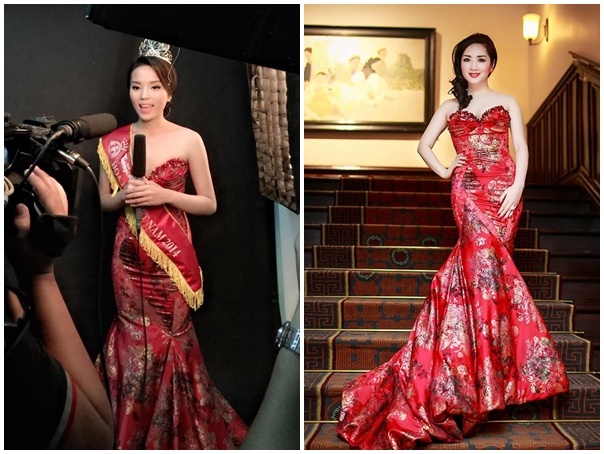 | Chiếc váy dạ hội gam màu đỏ, chất vải phi bóng, họa tiết vương giả được lòng hai mỹ nhân, hoa hậu Kỳ Duyên và Giáng My. Với thân hình cân đối, nước da trắng sáng, cả hai người đẹp đều được cho là phù hợp với trang phục sang trọng này. |