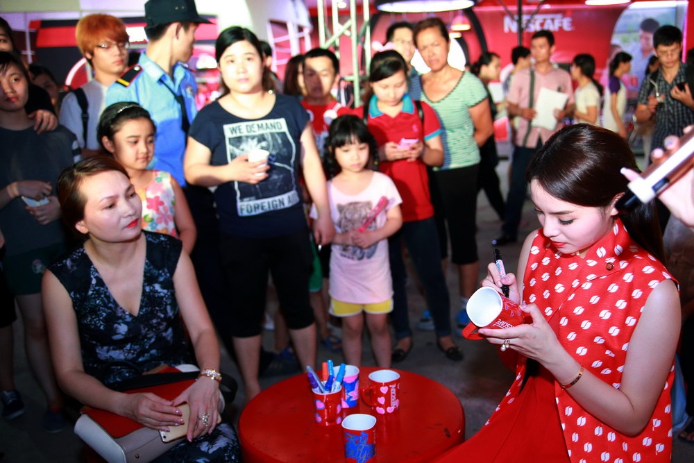 | Cô tham gia hoạt động ký tên vào ly lưu niệm tặng khán giả hâm mộ. Đồng hành cùng hoa hậu là mẹ ruột. |