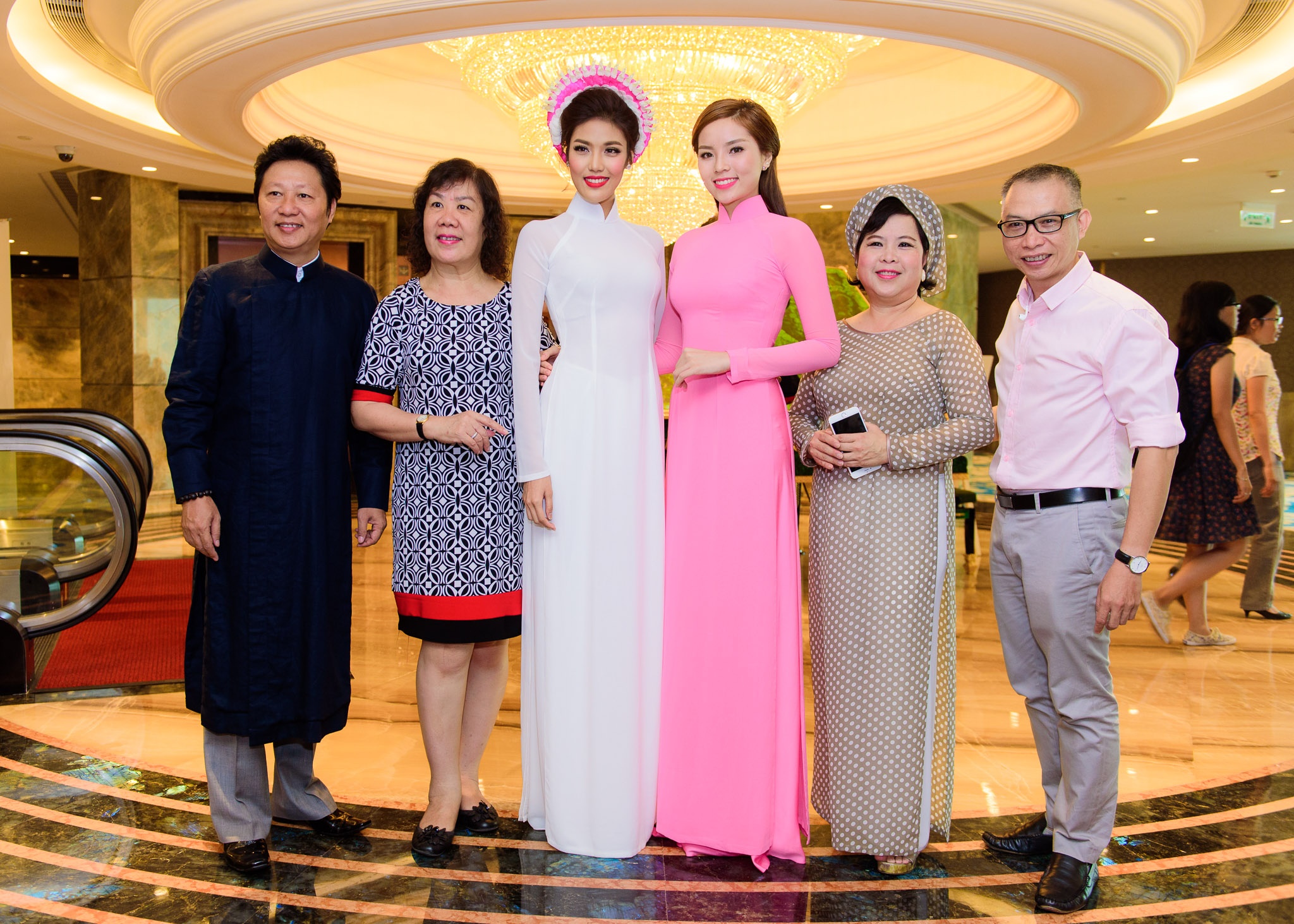 | Hai người đẹp hội ngộ cùng các thành viên giám khảo trong cuộc thi Duyên dáng áo dài như nhà thiết kế Sỹ Hoàng, Mai Hoa, nhiếp ảnh Phạm Hoài Nam. |