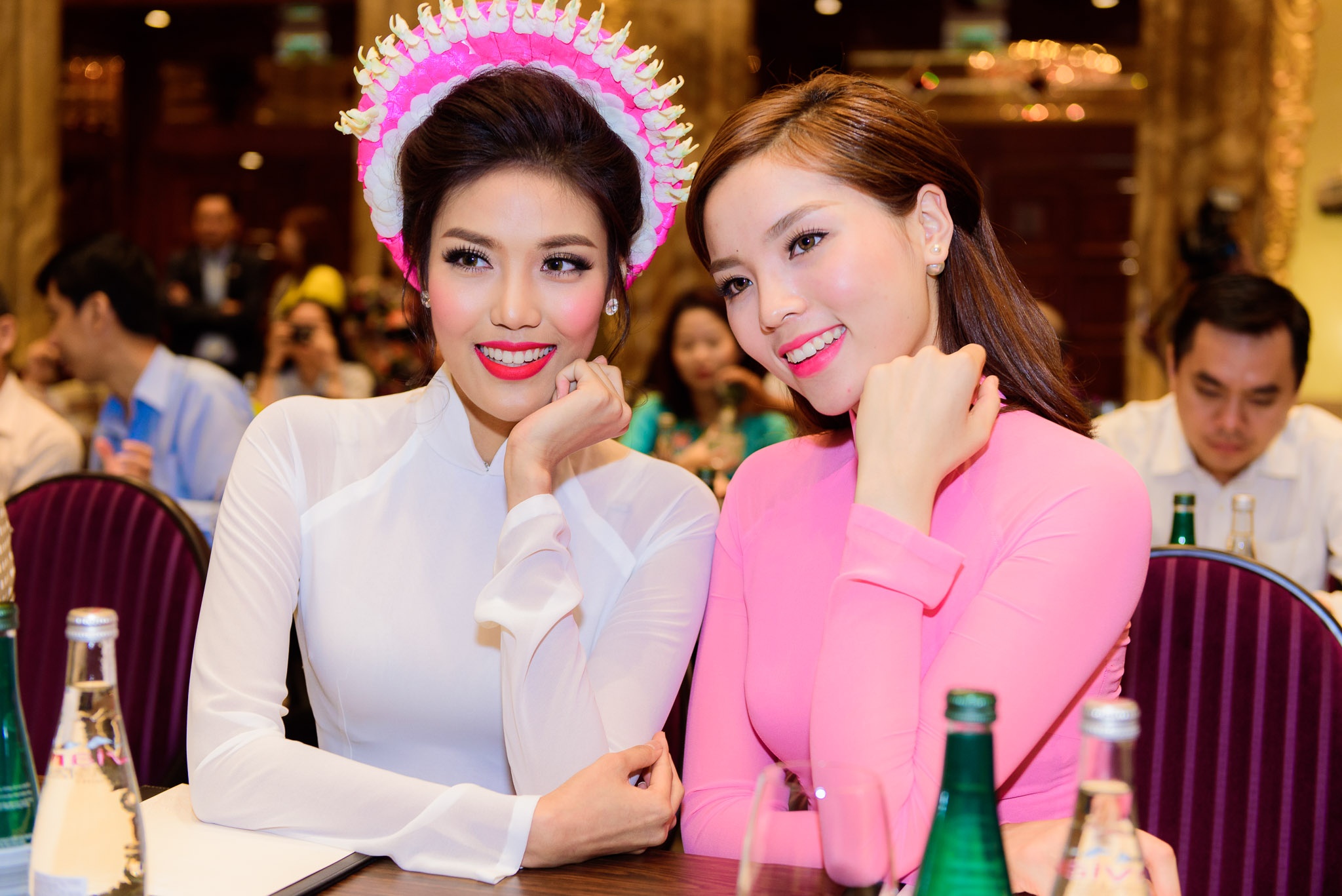 | Lan Khuê và Kỳ Duyên tranh thủ trò chuyện trước giờ họp báo. Cả hai cho biết, đều cảm thấy tự tin và duyên dáng hơn khi diện trang phục truyền thống. "Mỗi lần mặc áo dài, lại khơi gợi trong tôi những kỷ niệm về thời cấp 3 nghịch ngợm hay ngày thi Hoa hậu Việt Nam đáng nhớ" - người đẹp Nam Định chia sẻ. |