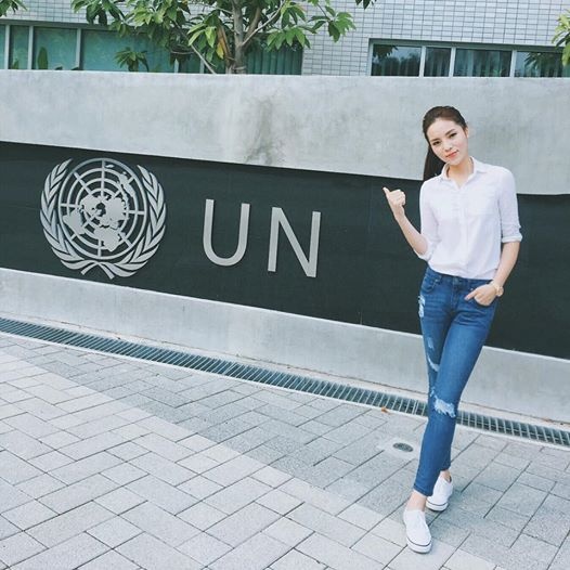 | Áo khoét nách đơn giản mix kèm chân váy họa tiết kẻ khoe vẻ năng động của Hoa hậu. |