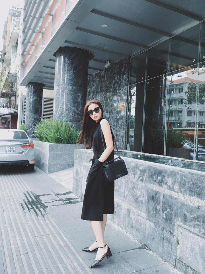 | Dù kết hợp cả cây đen nhưng Kỳ Duyên vẫn toát lên sự trẻ trung, năng động nhờ cách chọn kiểu dáng váy cách điệu và phụ kiện giày, túi ấn tượng. |