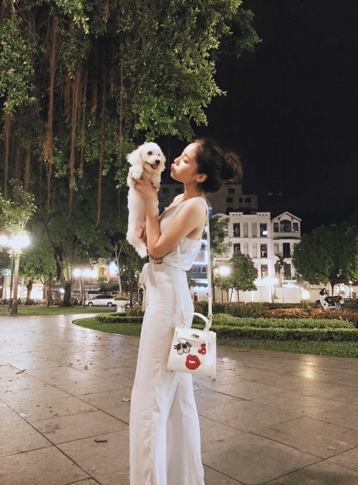 | Hoa hậu trẻ trung như một nữ sinh với cả cây jumpsuit trắng khi dạo phố. |