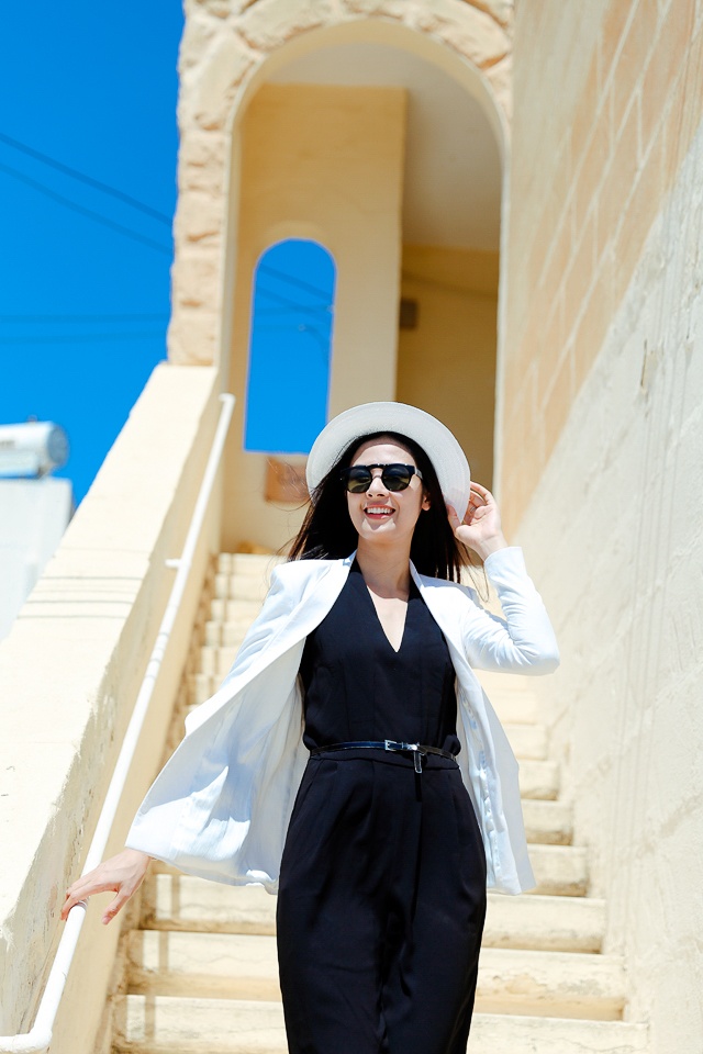 Hoa hậu Việt Nam 2010 diện trang phục gam màu trắng đen, kiểu cách hiện đại khi thả bộ trên bờ biển lãng mạn Gozo, thuộc nước Ý.