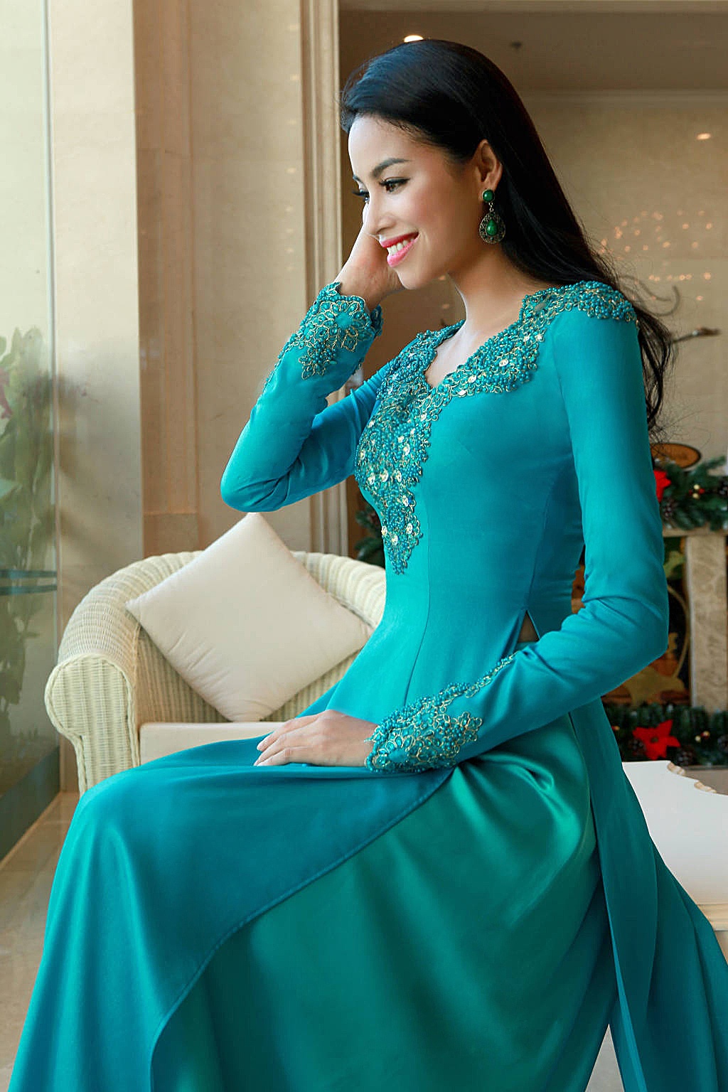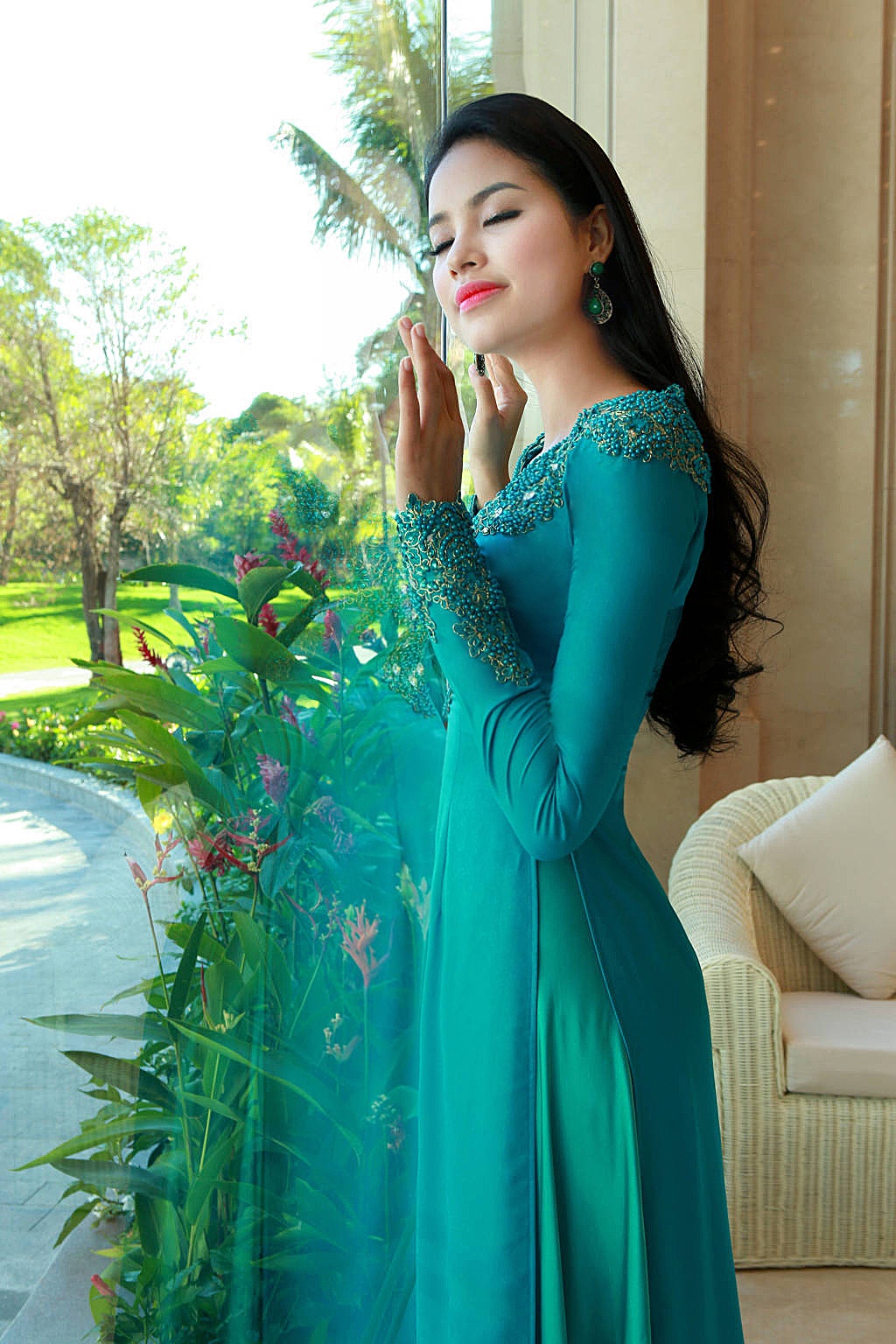Hoa hậu Hoàn vũ Việt Nam 2015 nữ tính và kiều diễm trong bộ áo dài lược cổ tinh tế.