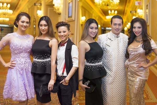 Minh Chánh - trưởng BTC lịch lãm với áo dài Sơn Collection sánh đôi cùng vợ Nathalee Trương xinh đẹp với dạ hội của Nick Dragon (thiết kế bởi stylist Đỗ Long). Hoa hậu Phu nhân Toàn cầu 2015 Kristine Thảo Lâm diện thiết kế sang trọng, quyến rũ đi dự tiệc cùng ca sĩ Leon Vũ và Hoàng Tuấn Việt. |