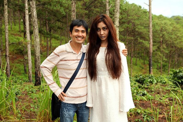 | Hoa hậu Đại dương Đặng Thu Thảo cùng đạo diễn Lê Quang Thanh Tâm trên phim trường Hợp đồng bắt ma. |