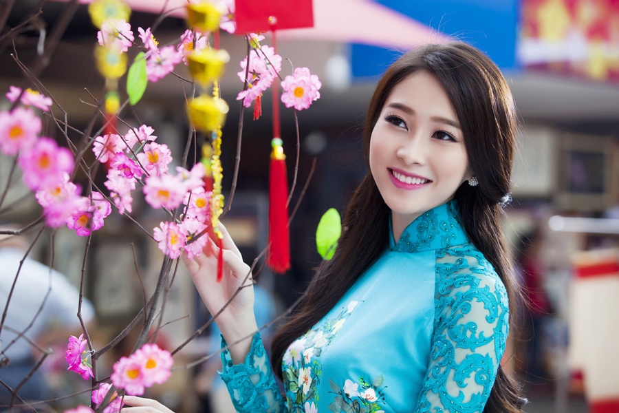 Trang phục áo dài tông màu xanh dịu dàng nổi bật giữa không gian vàng, đỏ đậm màu Tết.
