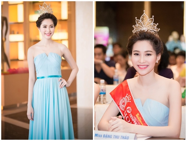 Trong buổi họp báo ra mắt cuộc thi Hoa hậu Việt Nam 2014 diễn ra tại Hà Nội, hoa hậu Đặng Thu Thảo gây chú ý với vẻ đẹp nền nã. Cô diện bộ cánh tông xanh kiểu cúp ngực để lộ vai trần cuốn hút. Bộ váy có tông màu xanh pastel hợp xu hướng, kèm điểm nhấn tại vòng eo giúp nhan sắc hàng đầu Việt Nam nhận được đánh giá là xinh tươi và quyến rũ nhất tuần vừa qua.