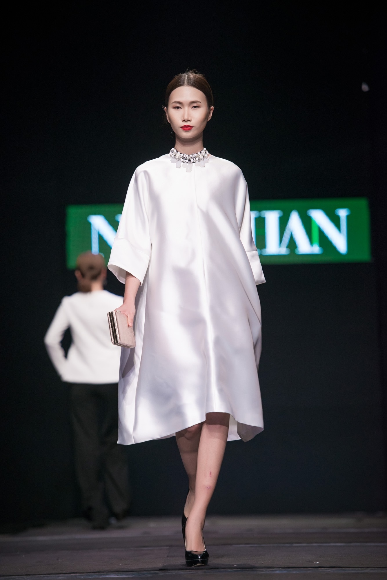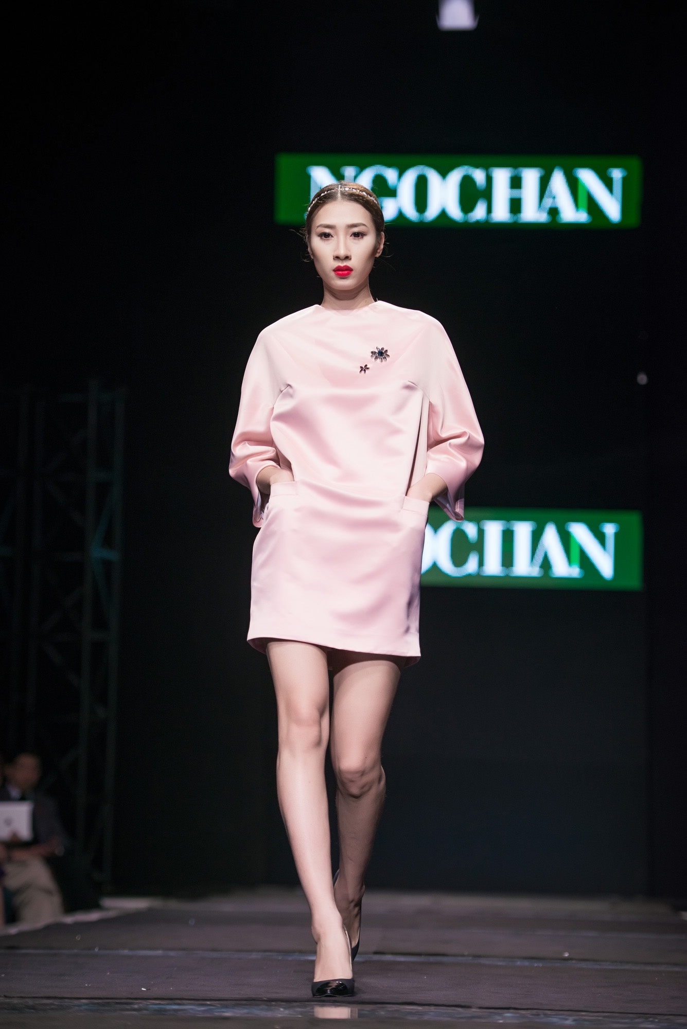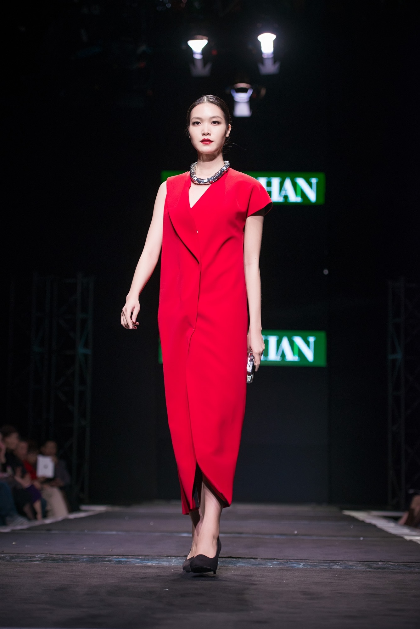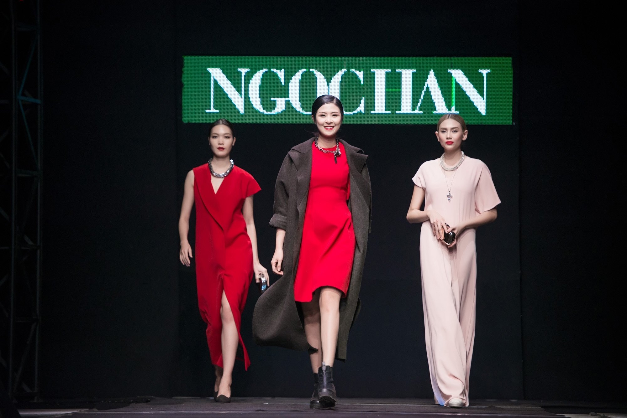 | Thùy Dung và Hoàng Yến tham gia trình diễn chốt màn ấn tượng BST thu đông của Ngọc Hân. Hoa hậu Việt Nam nổi bật trong bộ đầm suông gam đỏ bắt mắt. Người đẹp để tóc rẽ ngôi cổ điển, ăn ý cùng tông trang điểm gợi cảm. Phụ kiện ánh metallic làm điểm nhấn. |