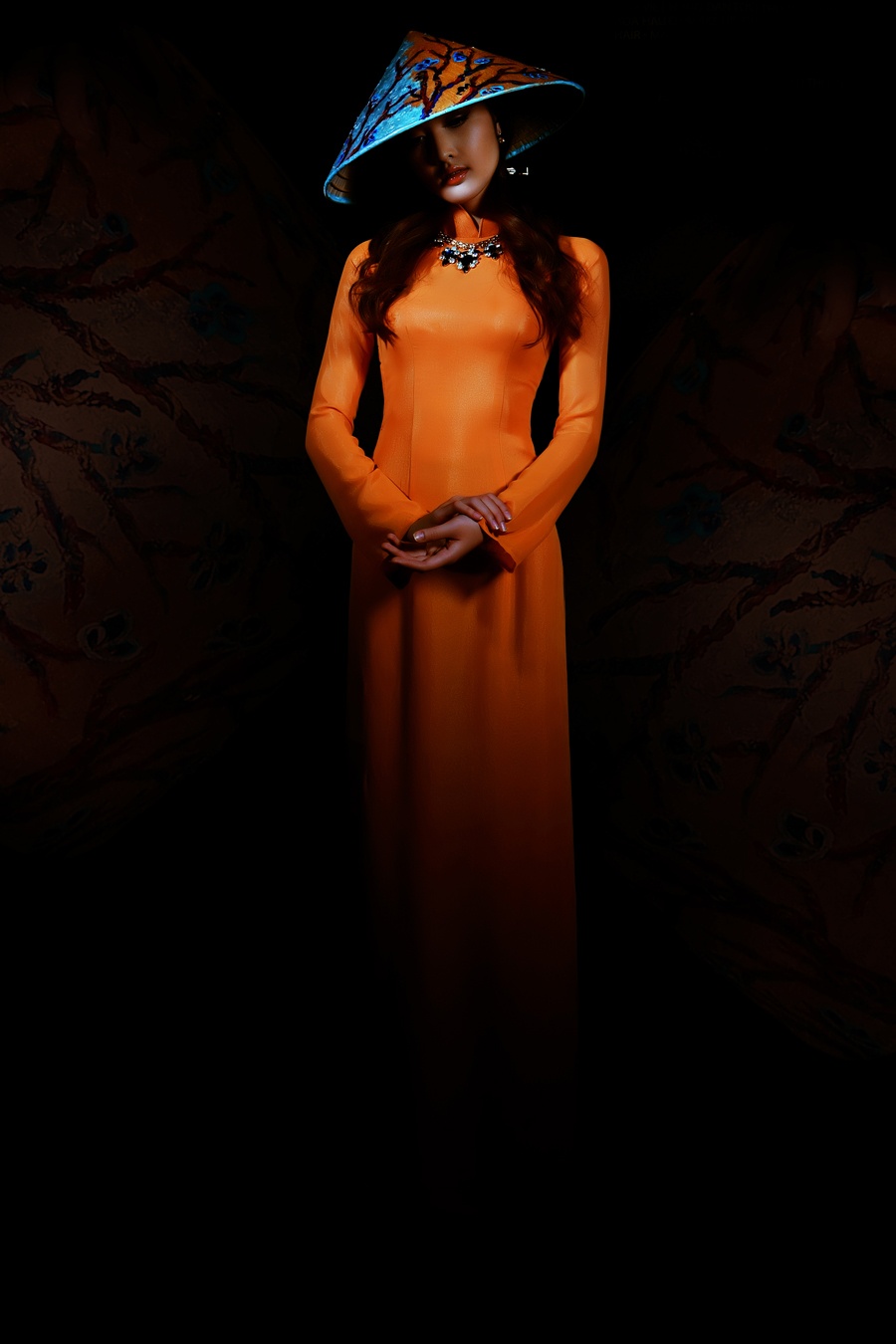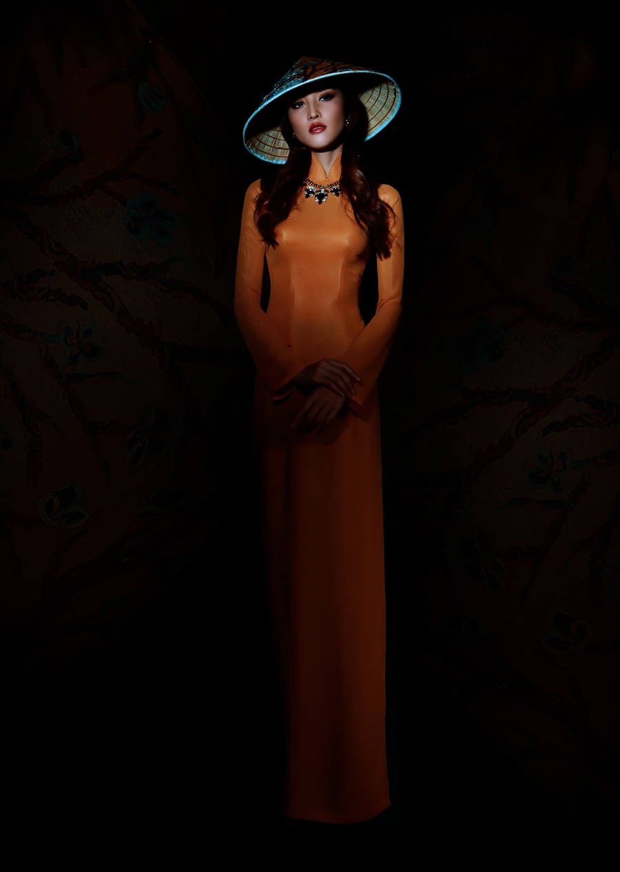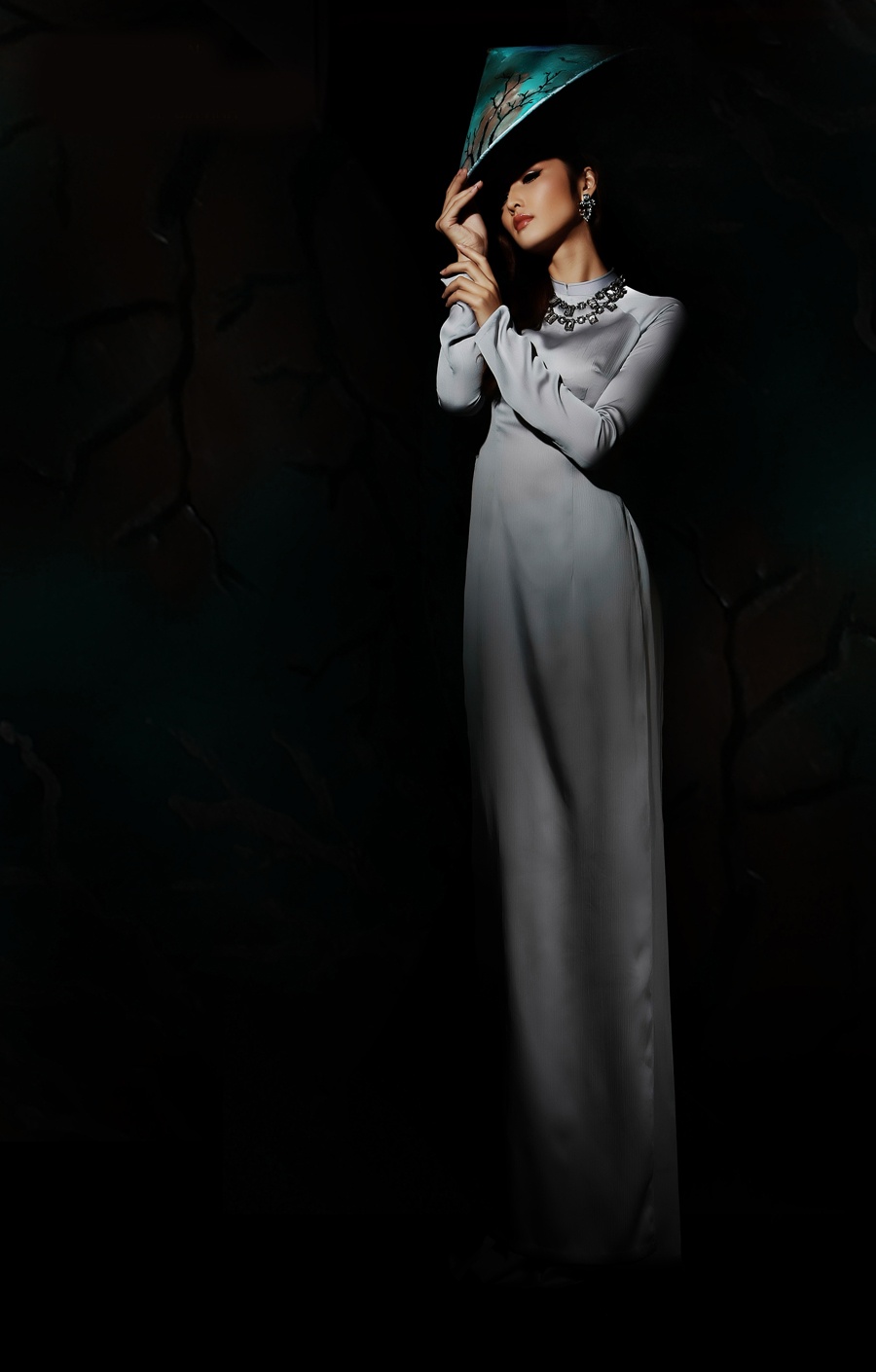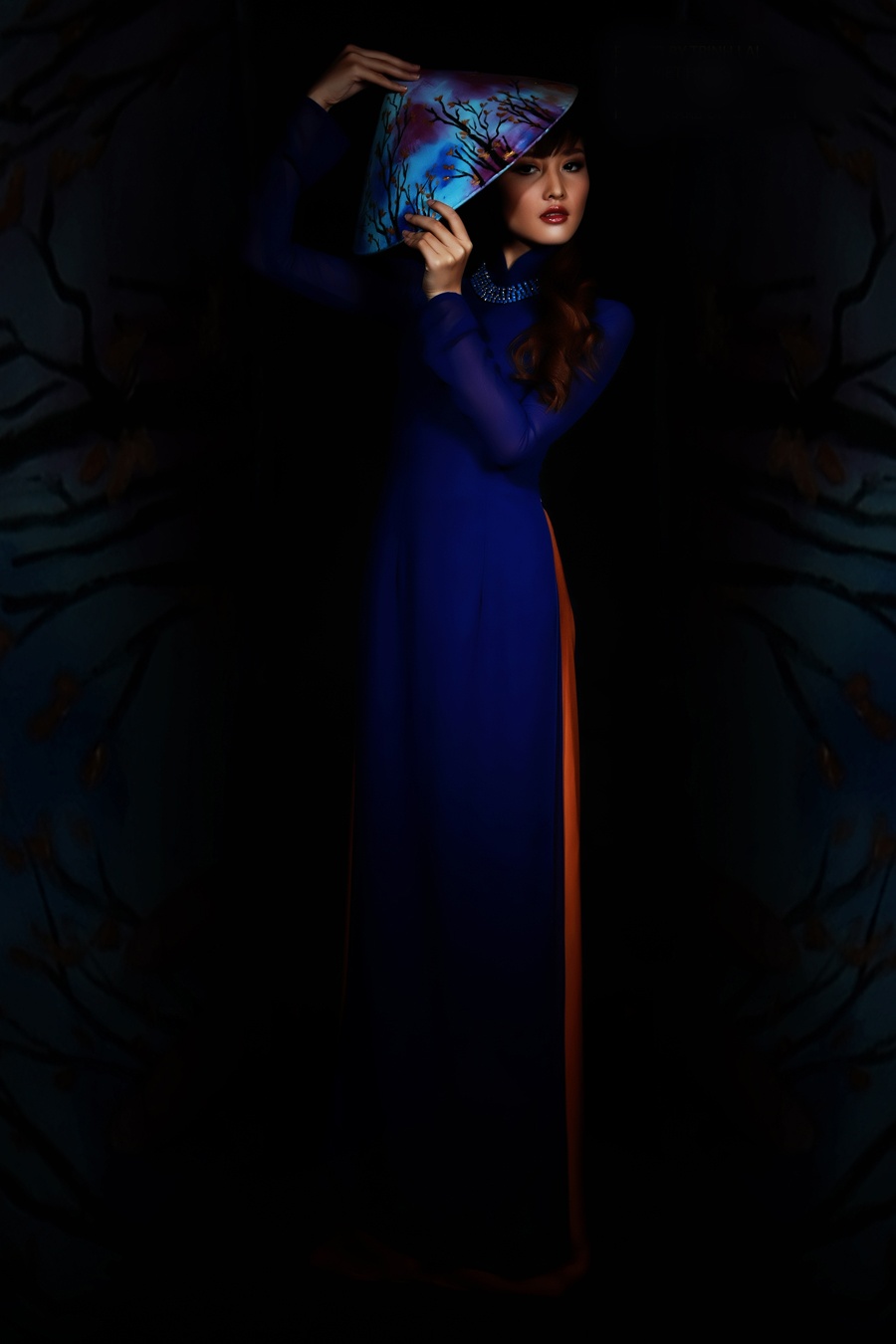 | Trong tà áo dài của nhà thiết kế Việt Hùng, người đẹp Cao Bằng e ấp và đầy bí ẩn bên chiếc nón lá được sơn vẽ tỉ mỉ. |